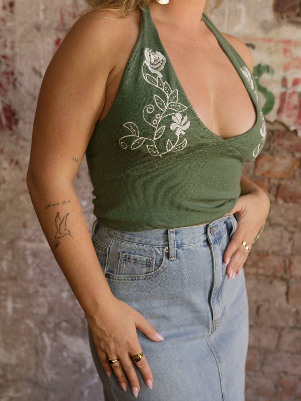 The Harper Halter Top is all about details and comfy vibes. With embroidered florals and a stretchy rib knit, it’s as sweet as it is effortless. Tie up the adjustable halter, pair with denim cutoffs, and you’re instantly in your “cute but casual” era.