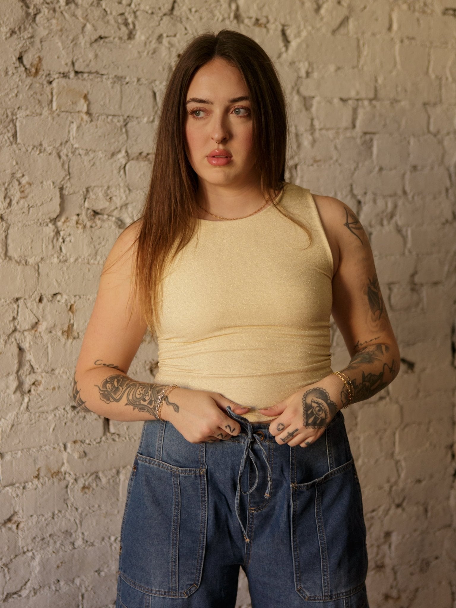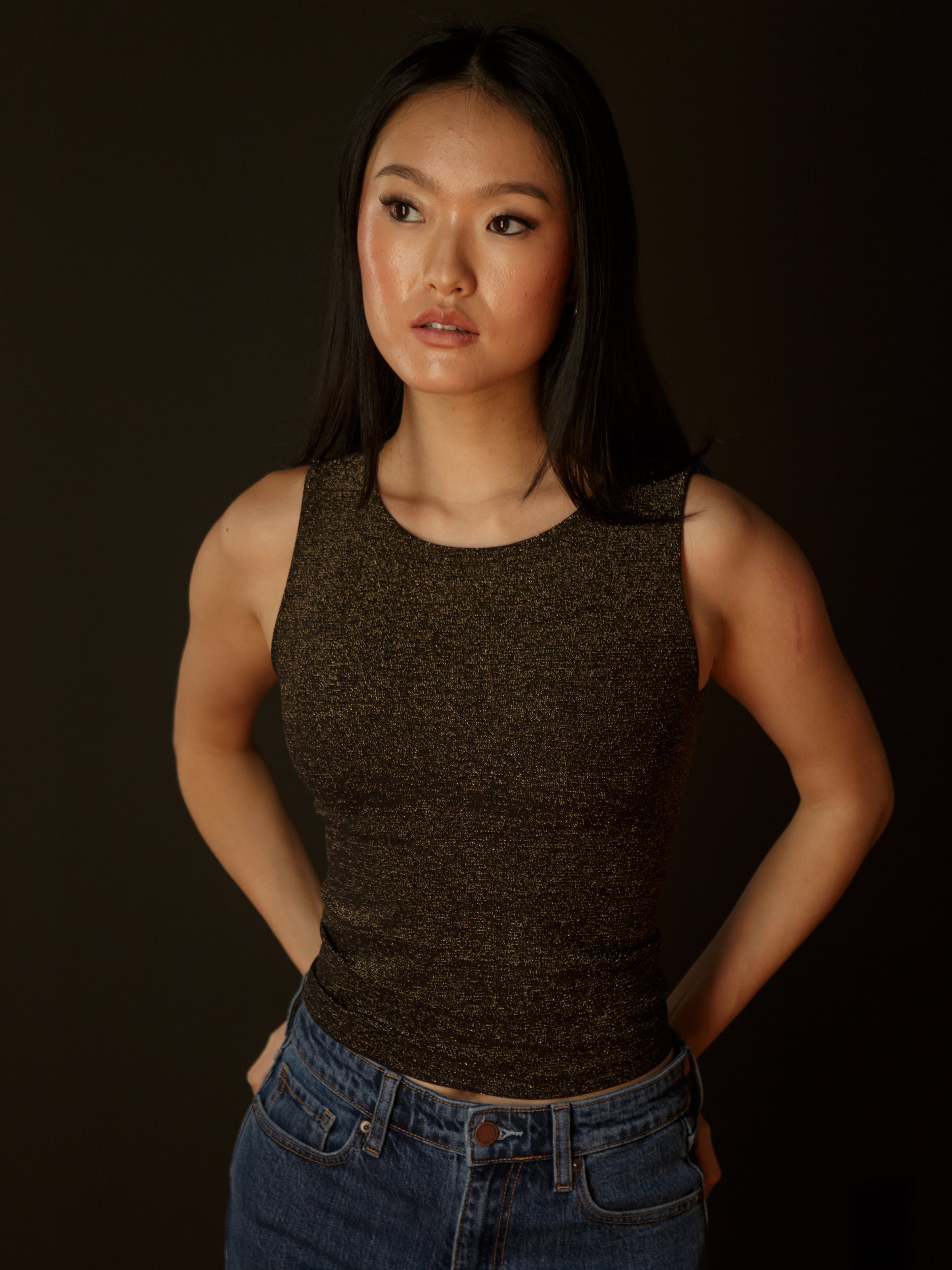 The Priya Top is sleek, shimmering, and ready to shine. With a high neck, sleeveless fit, and subtle shimmer threading, it’s perfect for pairing with high-rise jeans or a skirt for a night out. Ultra-stretchy fabric ensures comfort while keeping you glam.