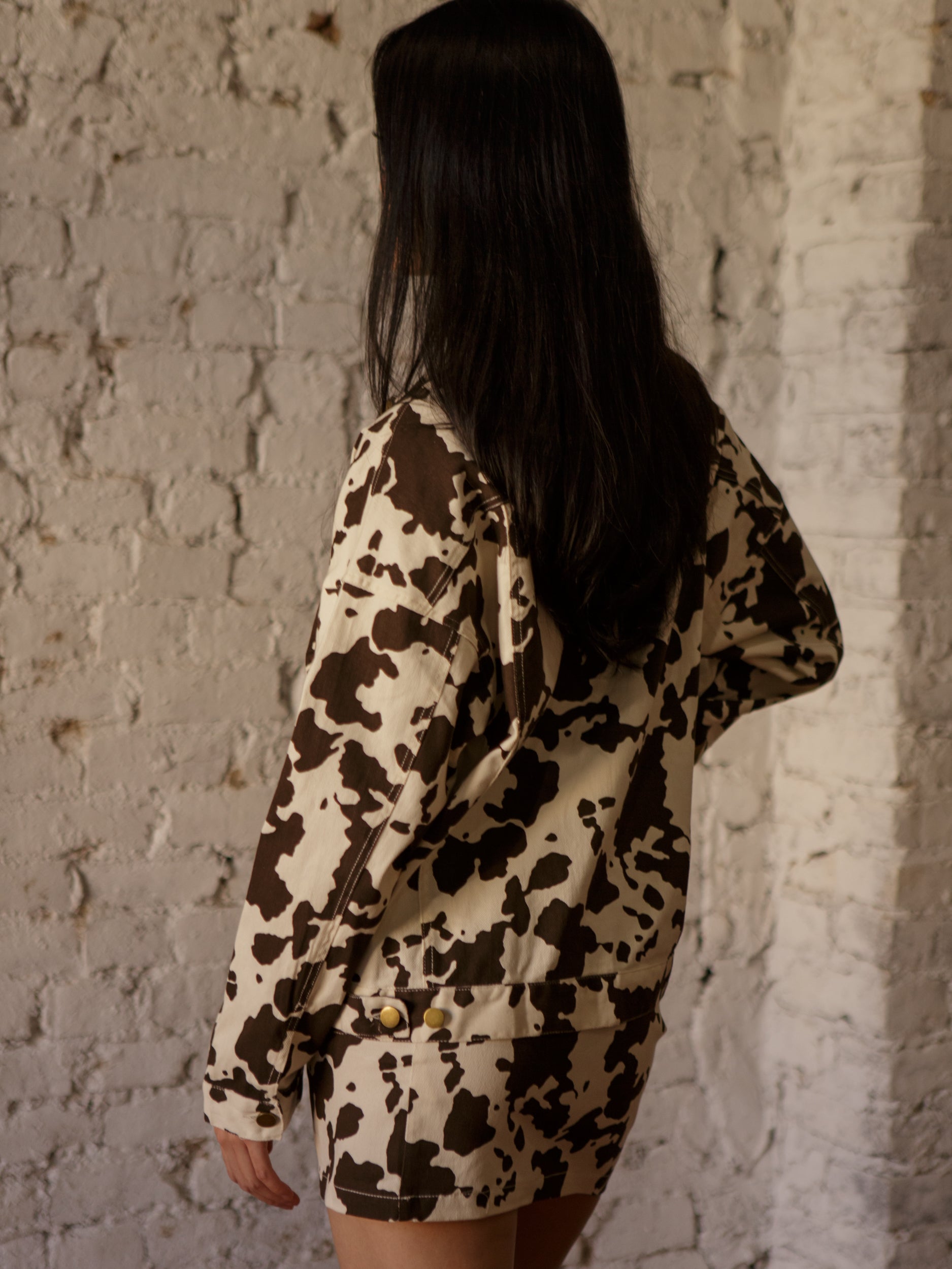 The Kavya Cow Jacket is the ultimate statement layer. With its collared neckline, button-up front, and bold cow print, this lightweight jacket brings instant cool-girl vibes. Style it over a tee and jeans or with the matching skirt for everyday flair.
