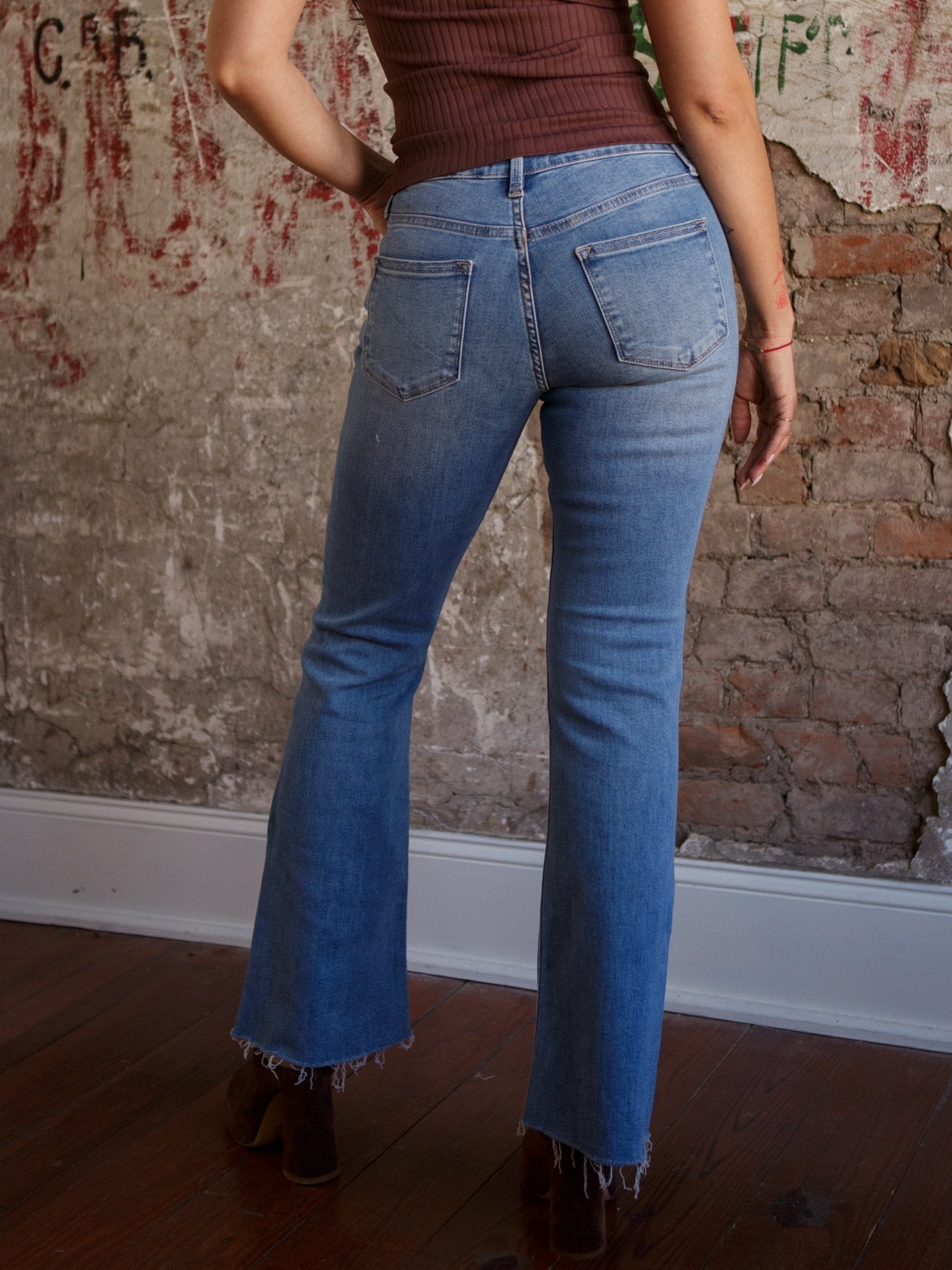 These medium wash flare jeans are the kind you’ll reach for on repeat. Fitted through the hips with a clean flare and subtle hem detail, they give you that leg-lengthening look without feeling over-the-top. Pair them with a fitted tee and boots for everyday wear or dress them up with a blouse and heels for dinner plans. Comfortable stretch included, obviously.