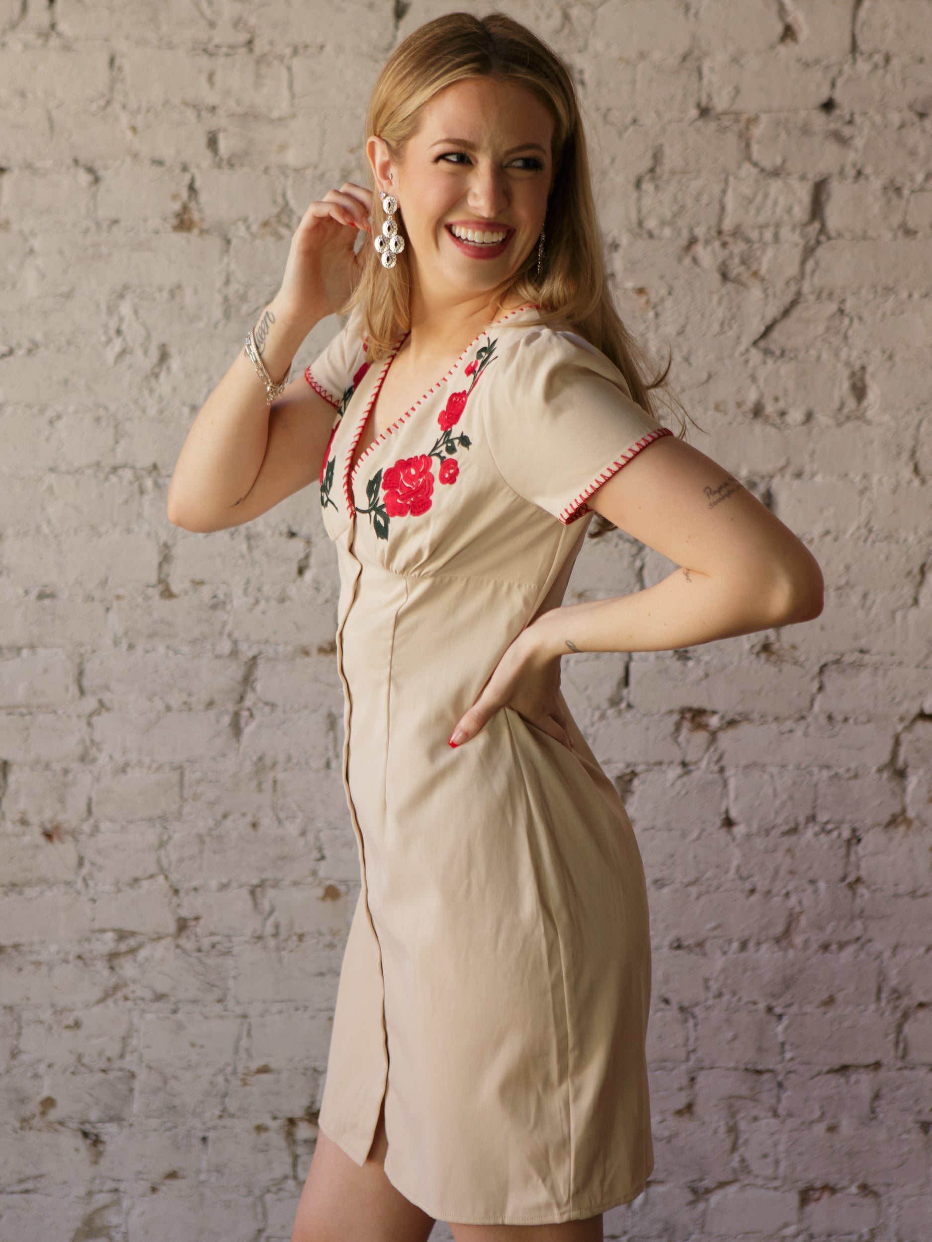 The Rosellan Button Dress is flirty, fitted, and full of charm. With embroidered roses, a bustier-style bodice, and button-up front, this mini is made for date nights or rooftop drinks. Just add strappy heels and a bold lip to seal the deal.