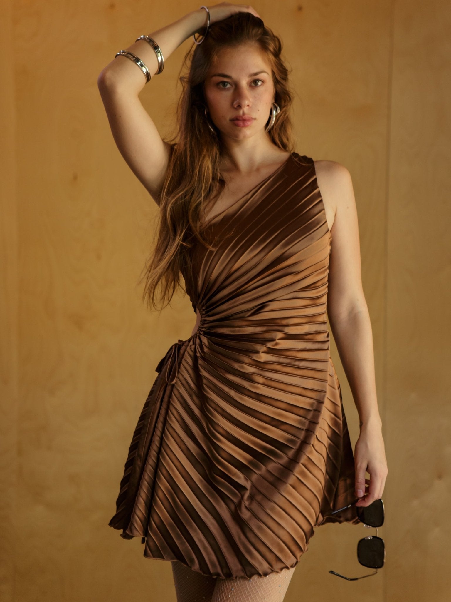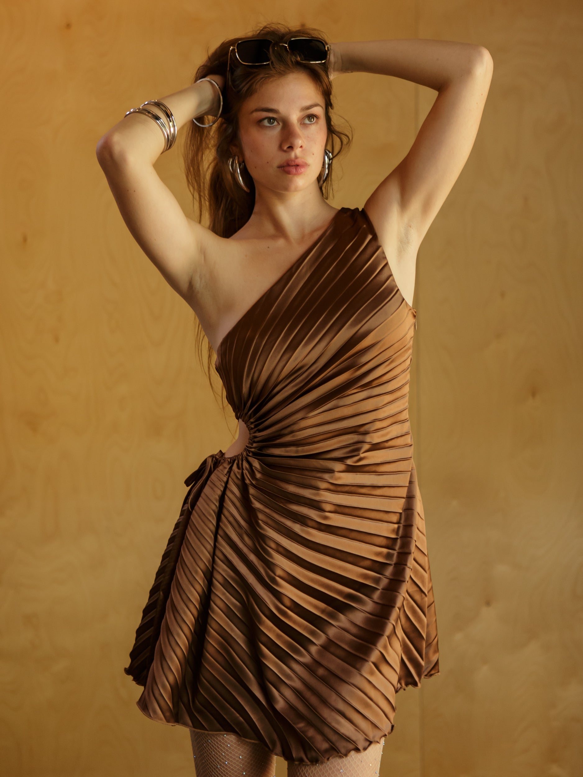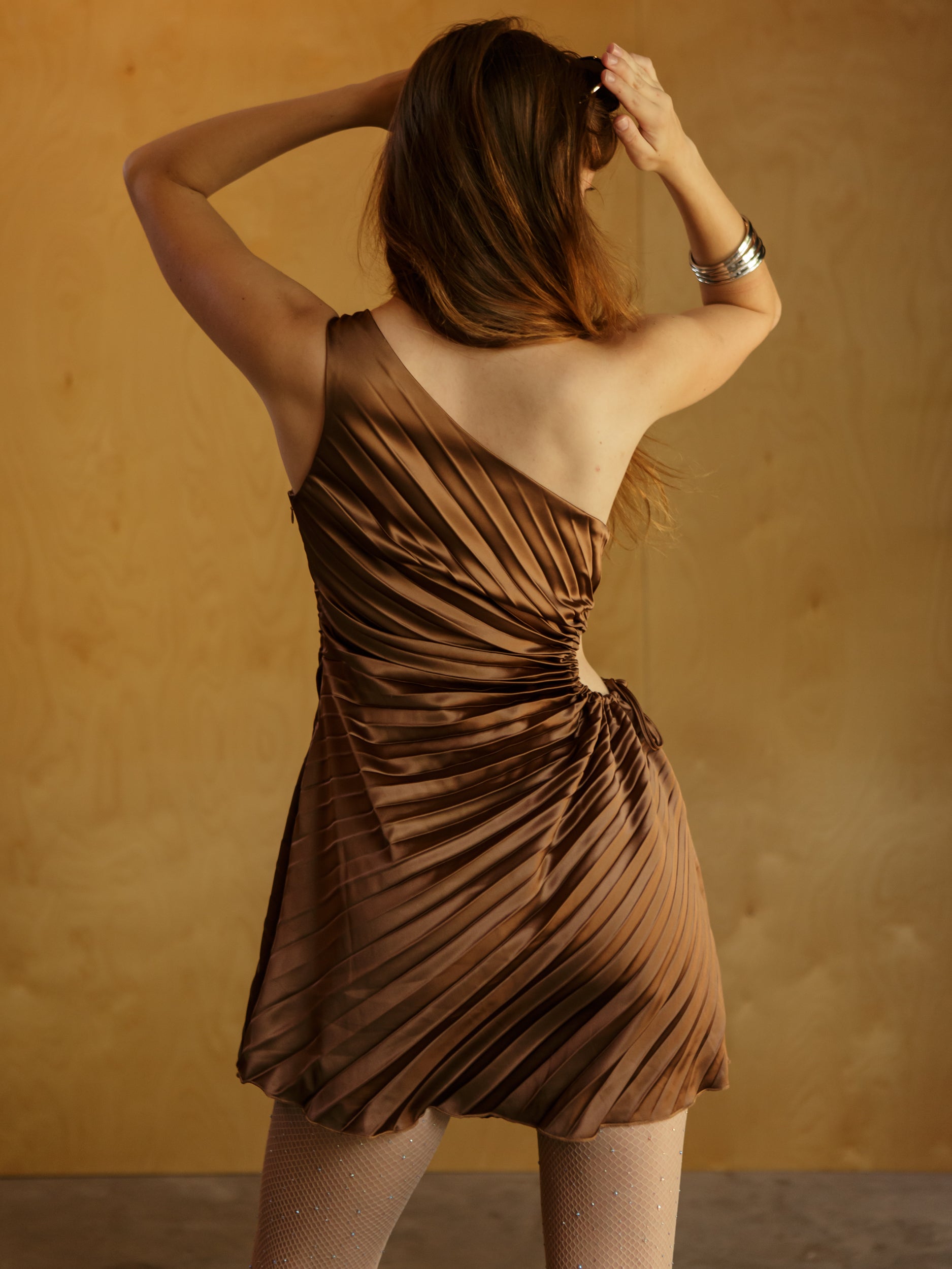 The Chelley One Shoulder Dress is your flirty-meets-fierce moment. With its one-shoulder neckline, side cutout with a tie detail, and all-over pleats, this mini brings all the drama in the best way. Just slip it on for nights out with the girls, rooftop dinners, or that party where you definitely want to turn heads.