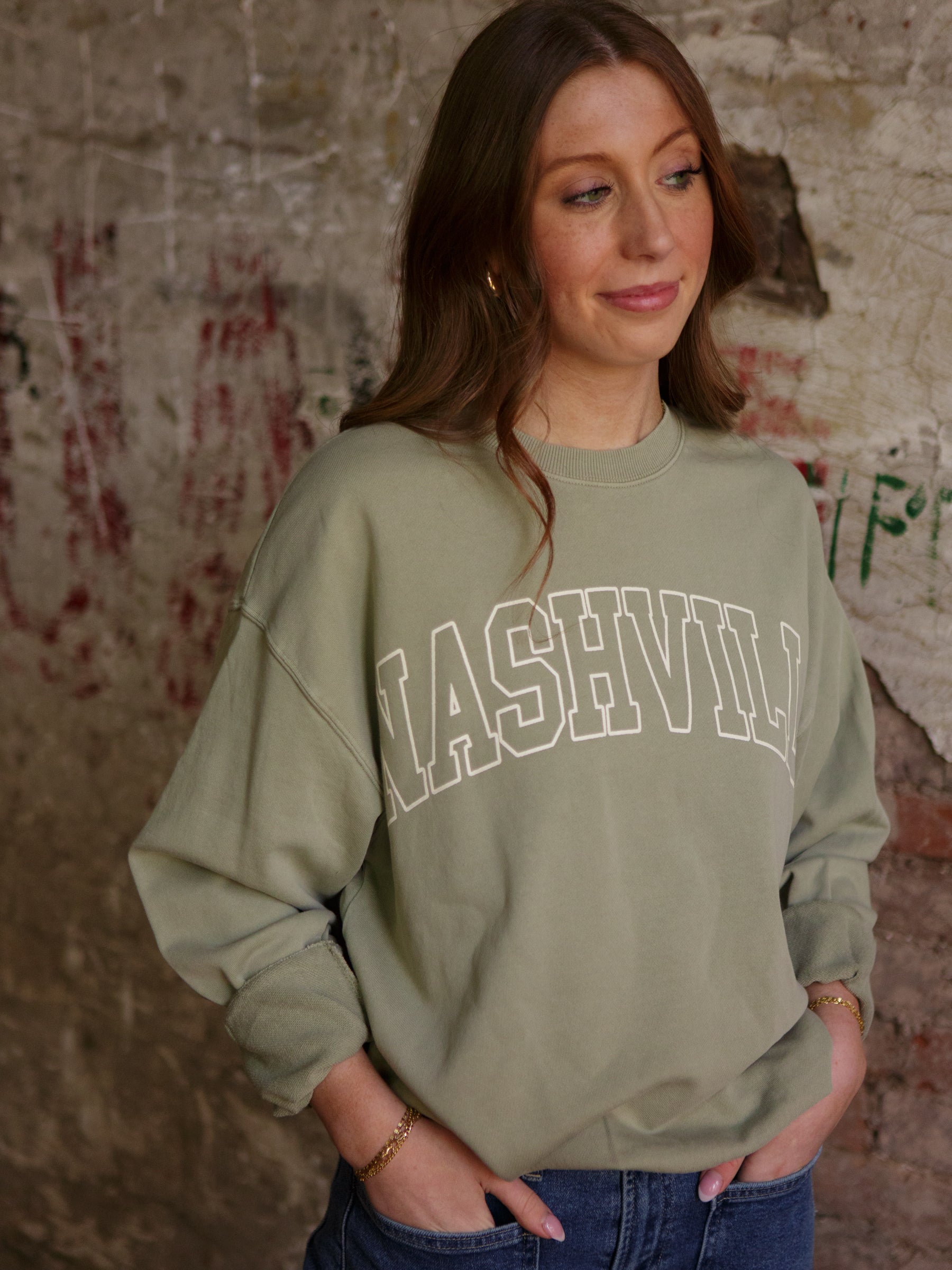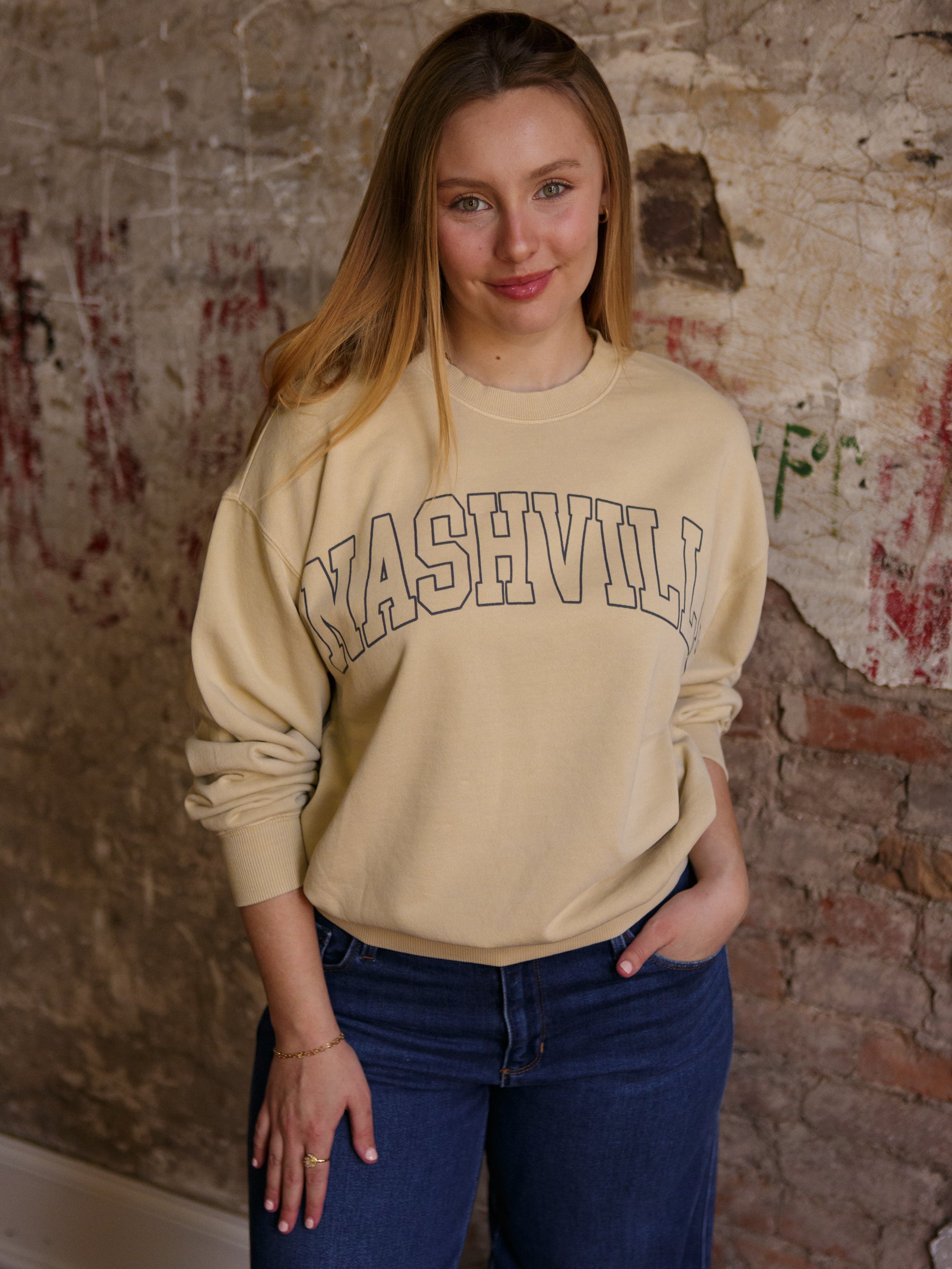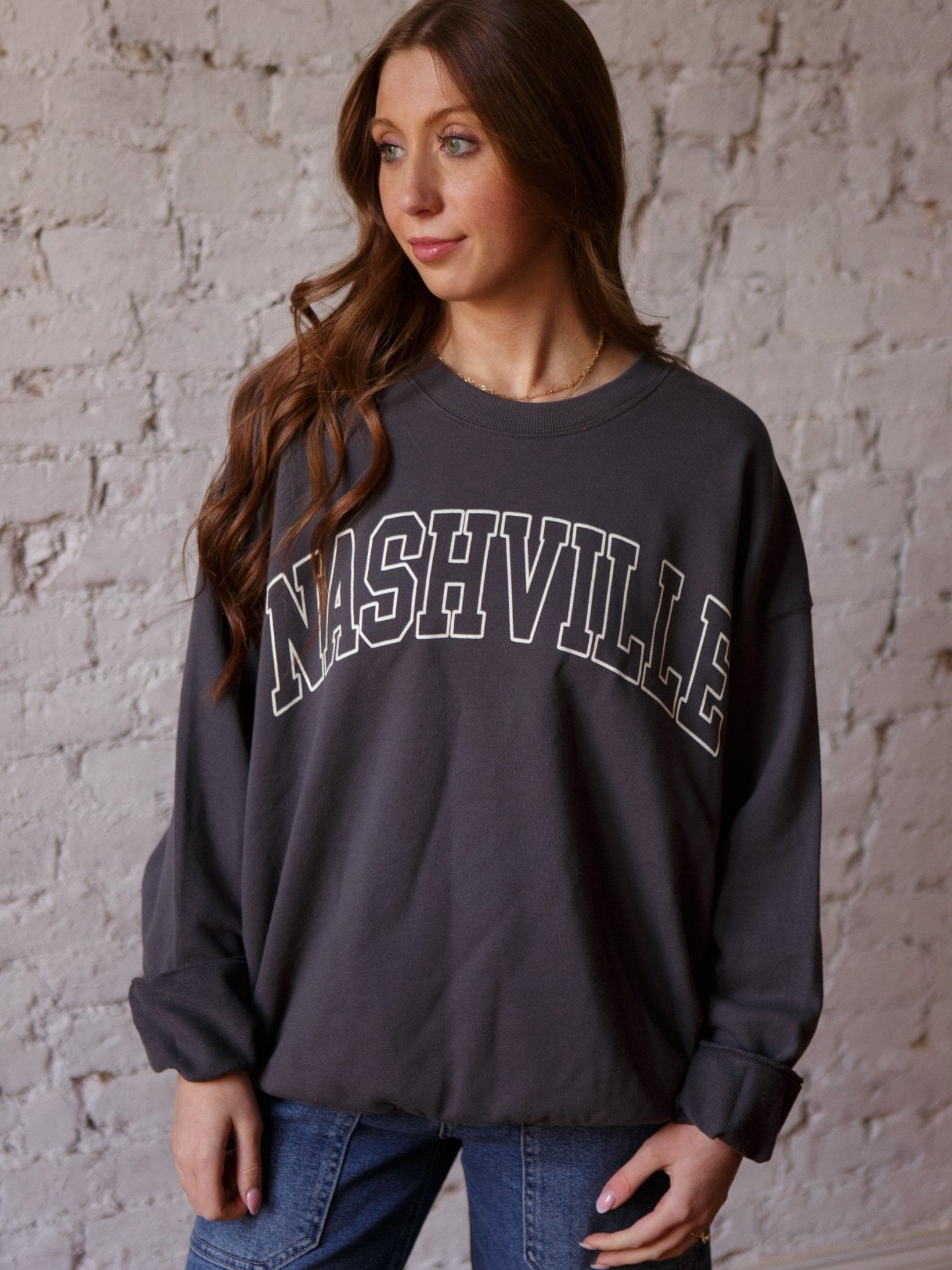 Head to Music City in cozy style with this Nashville Outline Sweatshirt! This oversized, comfy piece lets everyone know who your favorite city is, announcing that you've got the beat of Nashville running through your veins. Pair with your favorite denim and boots!