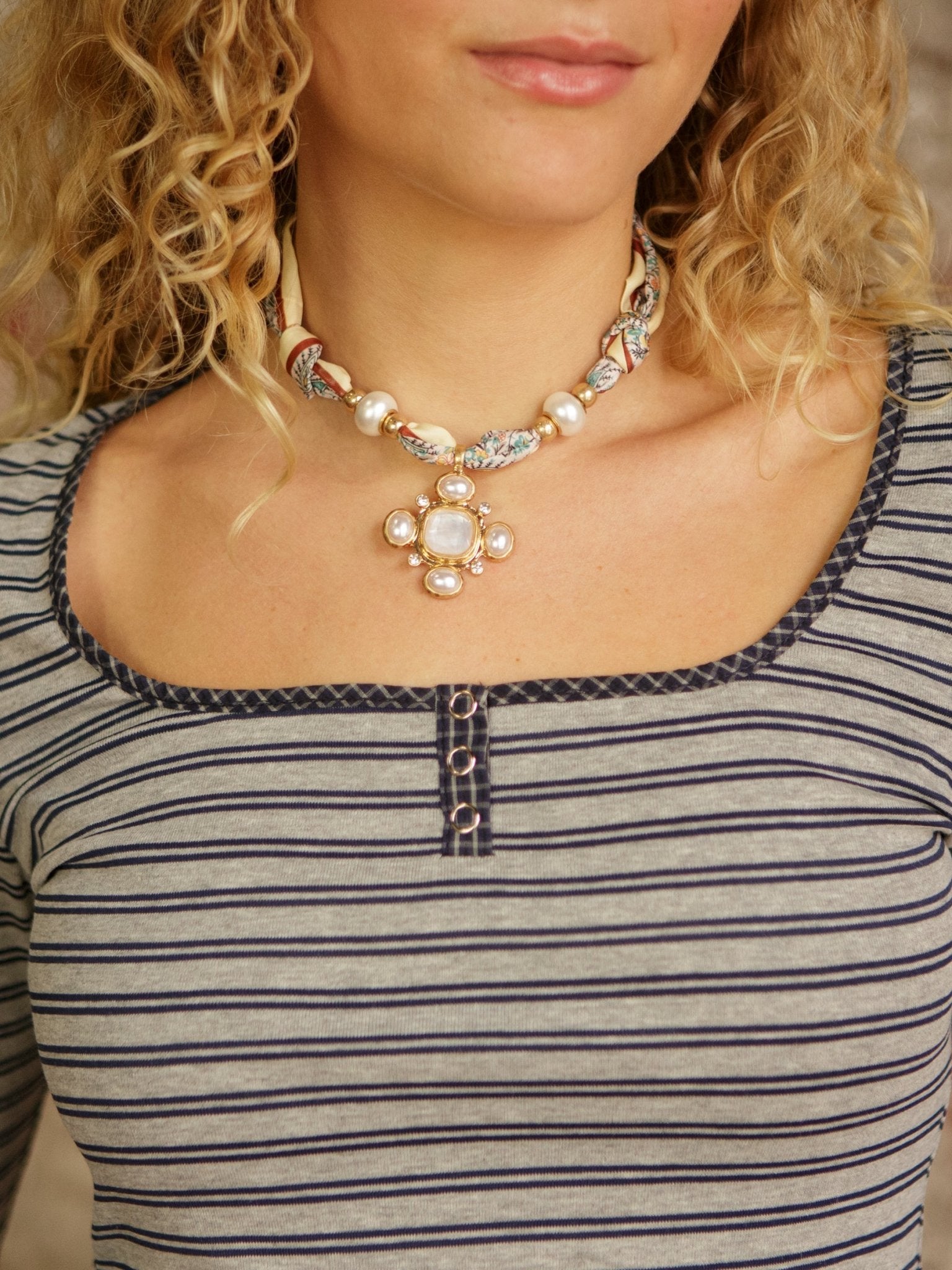 Meet the On Board Scarf Necklace — the accessory that instantly makes your outfit look way more curated. The multicolored scarf ties neatly around your neck, while the pearl beading and pendant add that little touch of “oh, this? I just threw it on.”