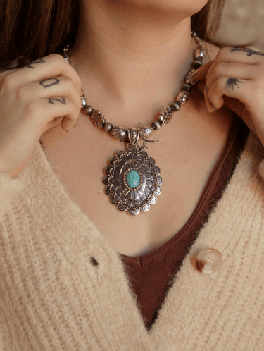 The Payson Turquoise Necklace is a statement piece with a touch of southwestern charm. Featuring a silver beaded chain, large pendant, and turquoise gem detail, it’s perfect for layering or wearing solo to elevate any outfit.