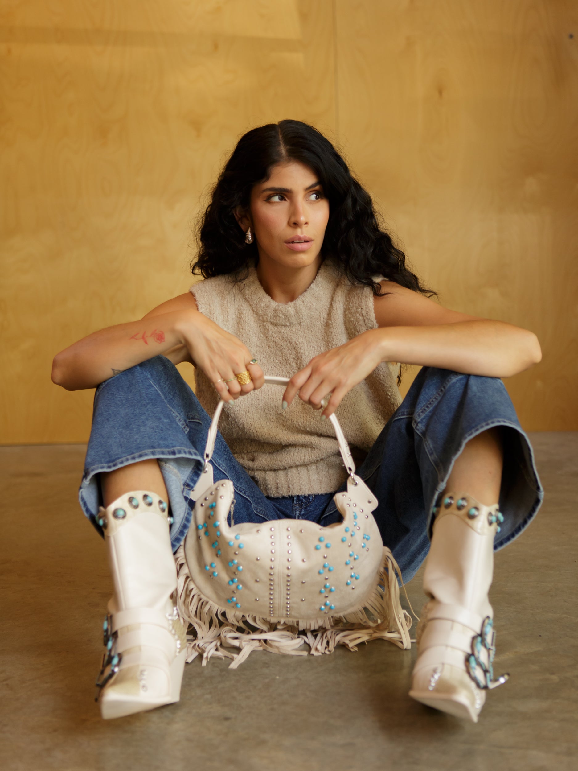 The Say Less Stud Bag is western-inspired perfection with faux suede, turquoise studs, and fringe details. With a secure zipper closure and easy shoulder bag style, it’s the perfect mix of fun and functional.