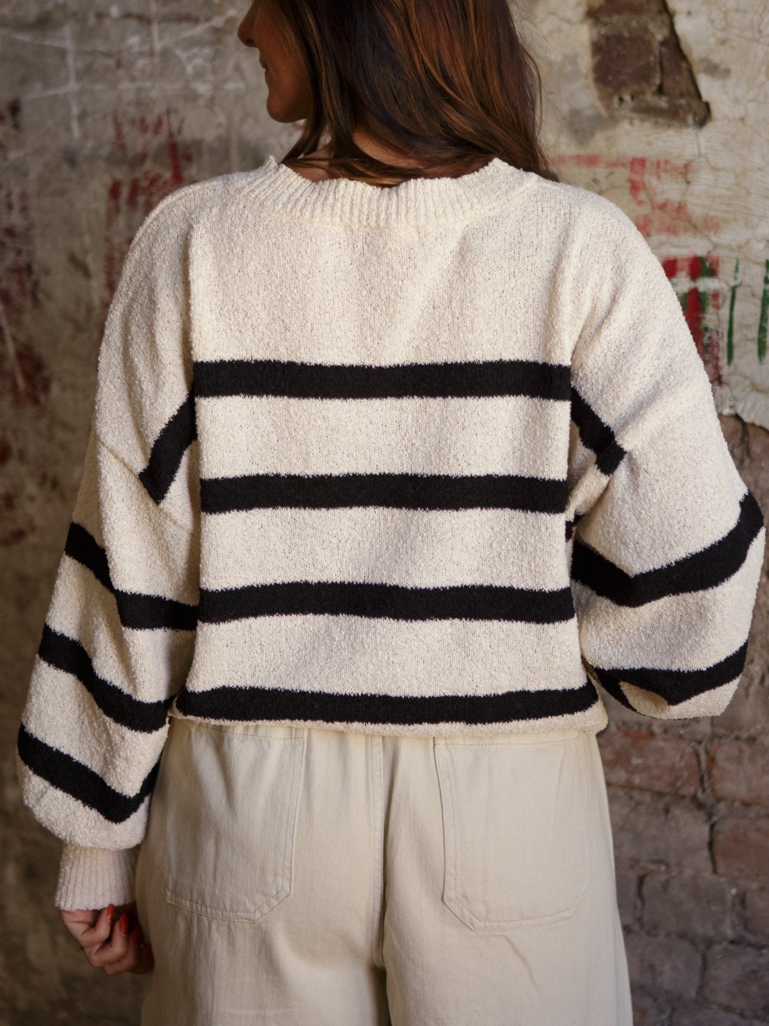 Classic with a twist—the Charee Striped Sweater is a wardrobe essential! Lightweight knit, ribbed trim, and relaxed fit make it perfect for layering or wearing solo, while the playful stripes add a fun, casual vibe.