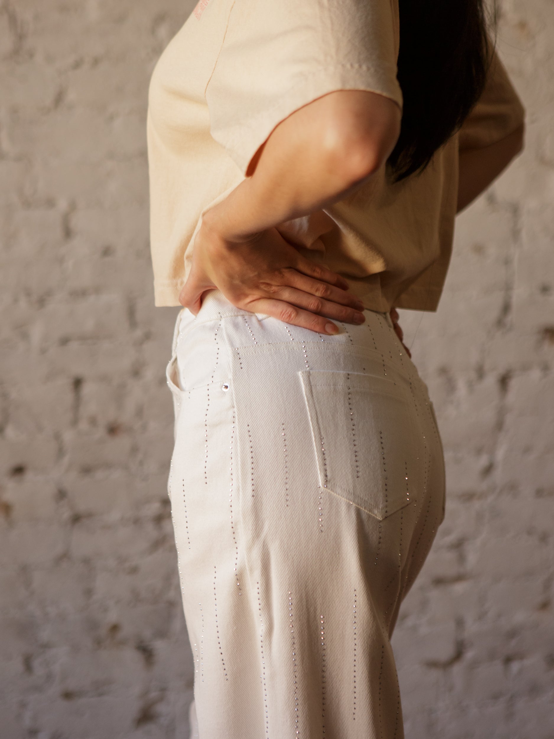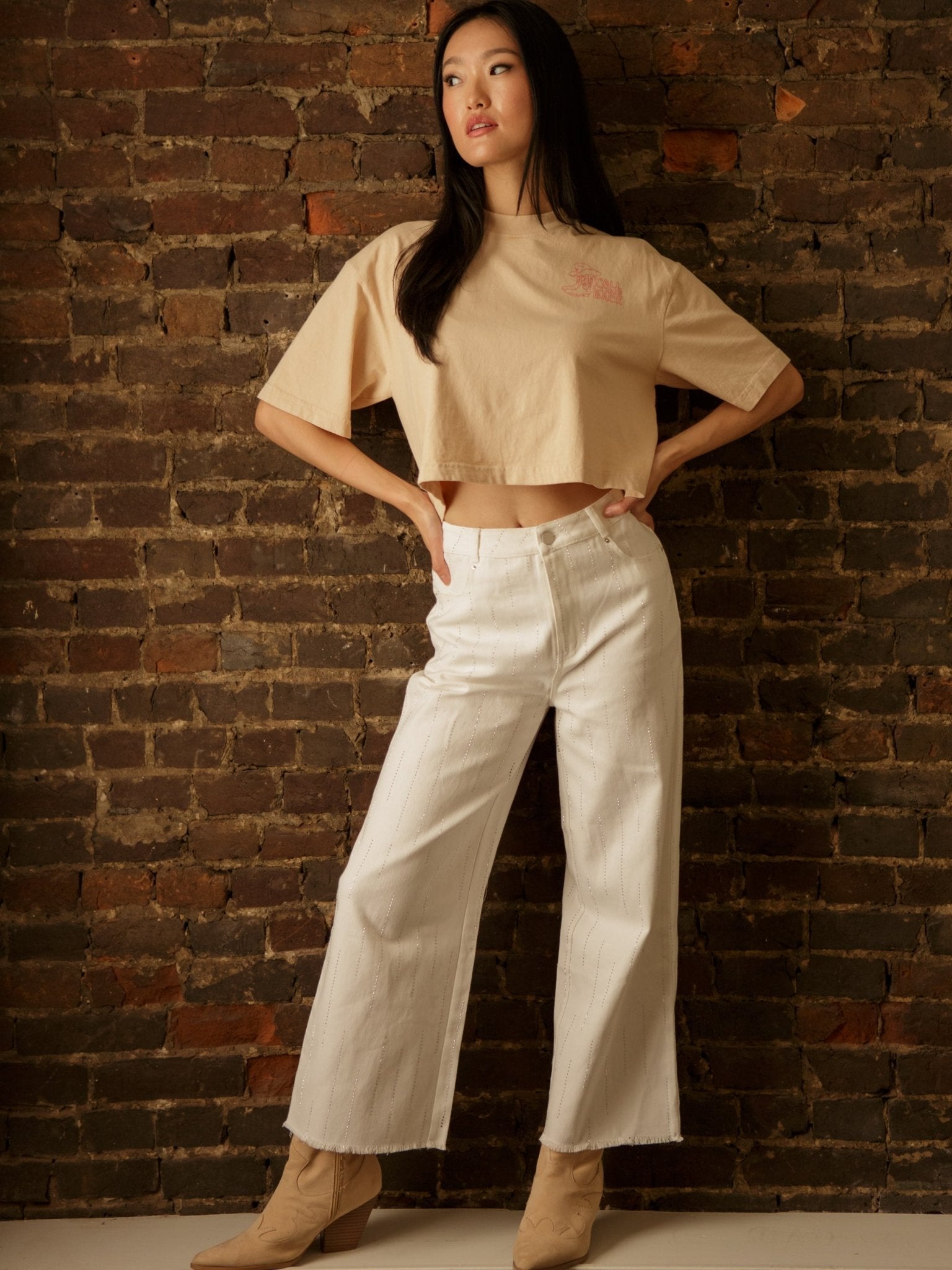 The Liza Striped Denim is all about cool-girl sparkle. With a high-rise fit and rhinestone stud accents, these jeans bring a little glam to your everyday look. Style them with a simple tee and sneakers for daytime or dress them up with a satin cami for a night out.