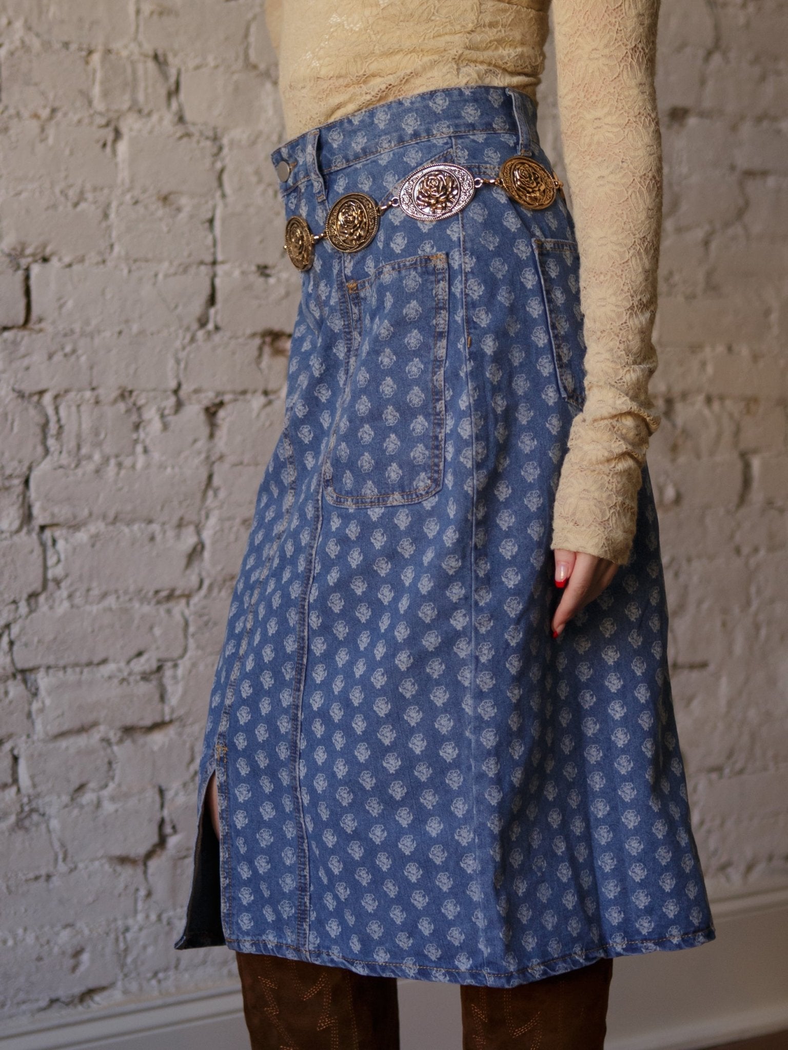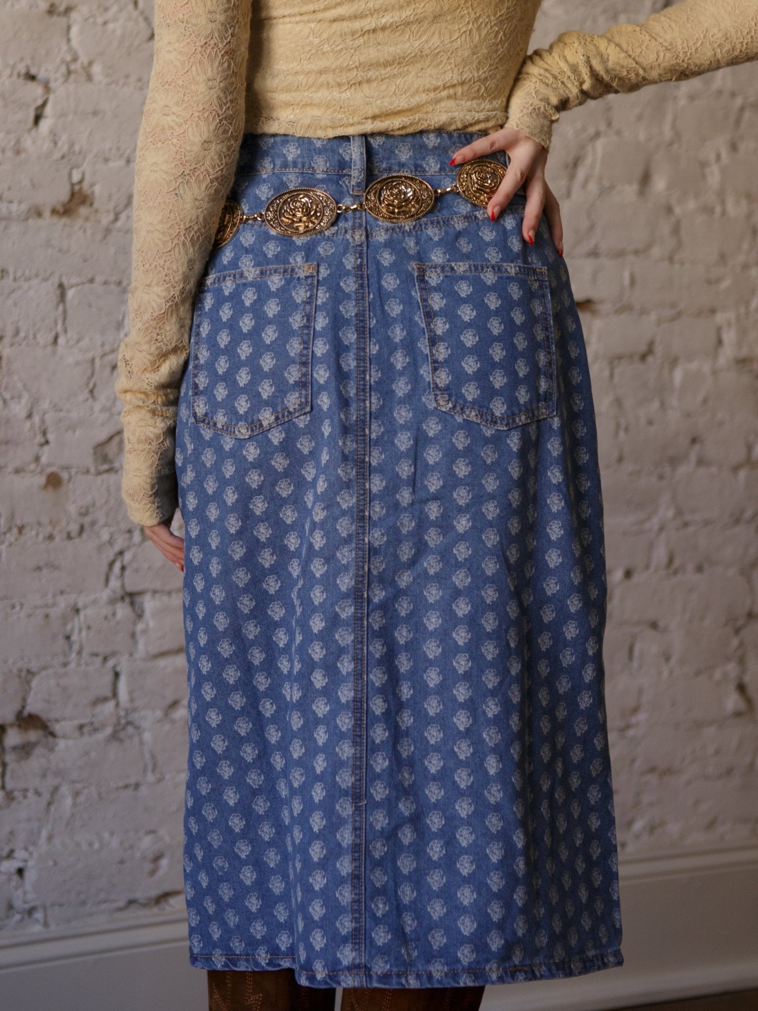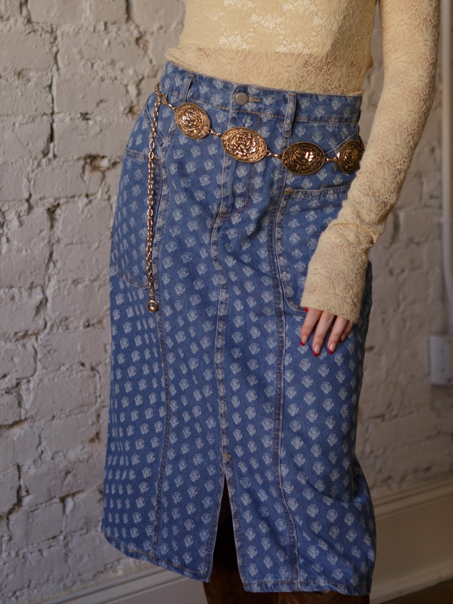 The Marlena Denim Skirt brings a playful twist to a classic fave! With a floral print, front slit, and large patch pockets, this mid-rise midi is equal parts cute and cool. Pair it with a fitted tee or chunky sweater for an effortless everyday look.