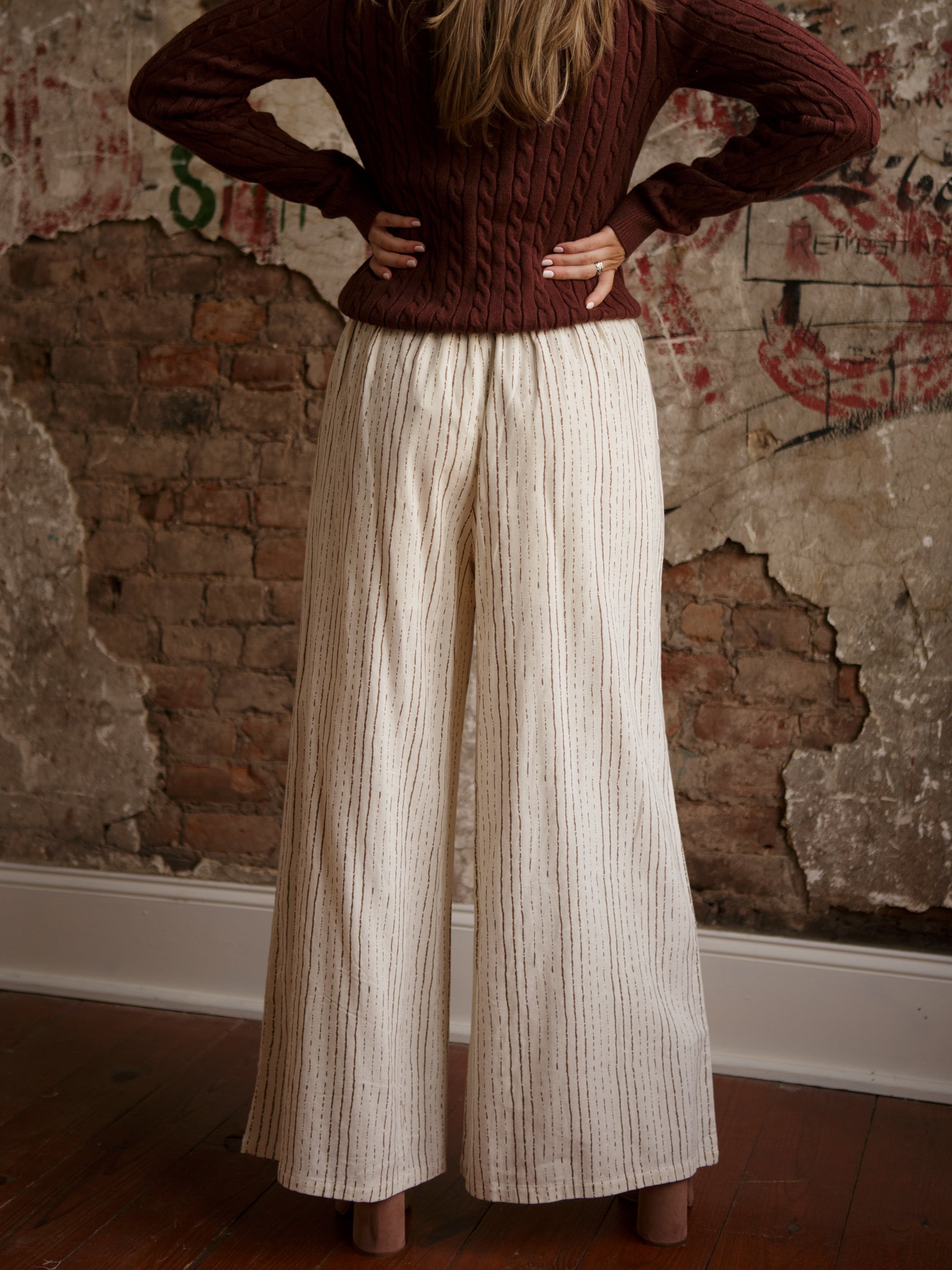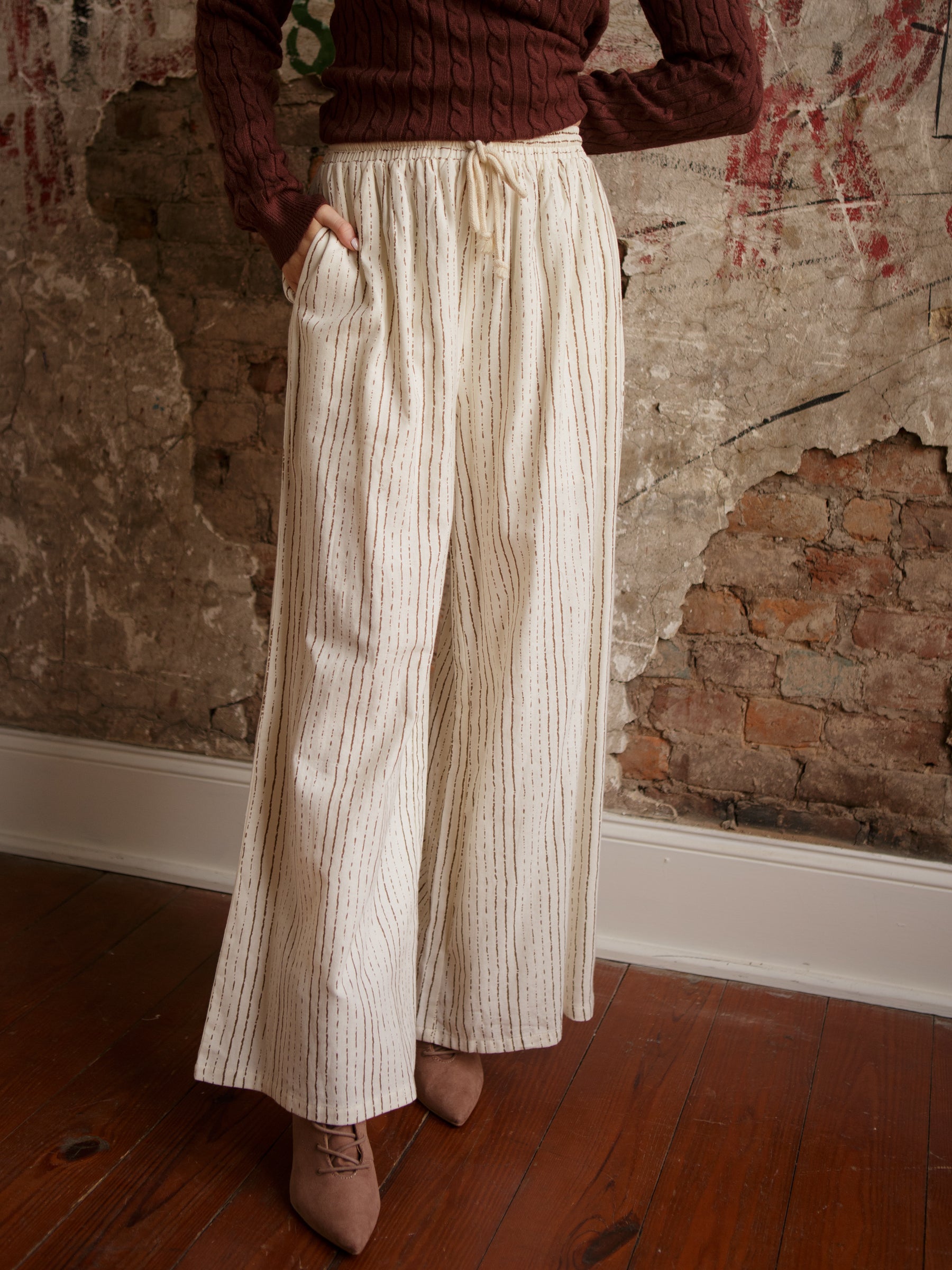 The Agatha Striped Pants are made for comfort that still looks chic. With a high-rise fit, adjustable drawstring waist, and an ultra-wide leg, these flowy striped pants bring easy drama to any outfit. Perfect for pairing with a simple tank for errands or dressing up with a sleek top for dinner plans.