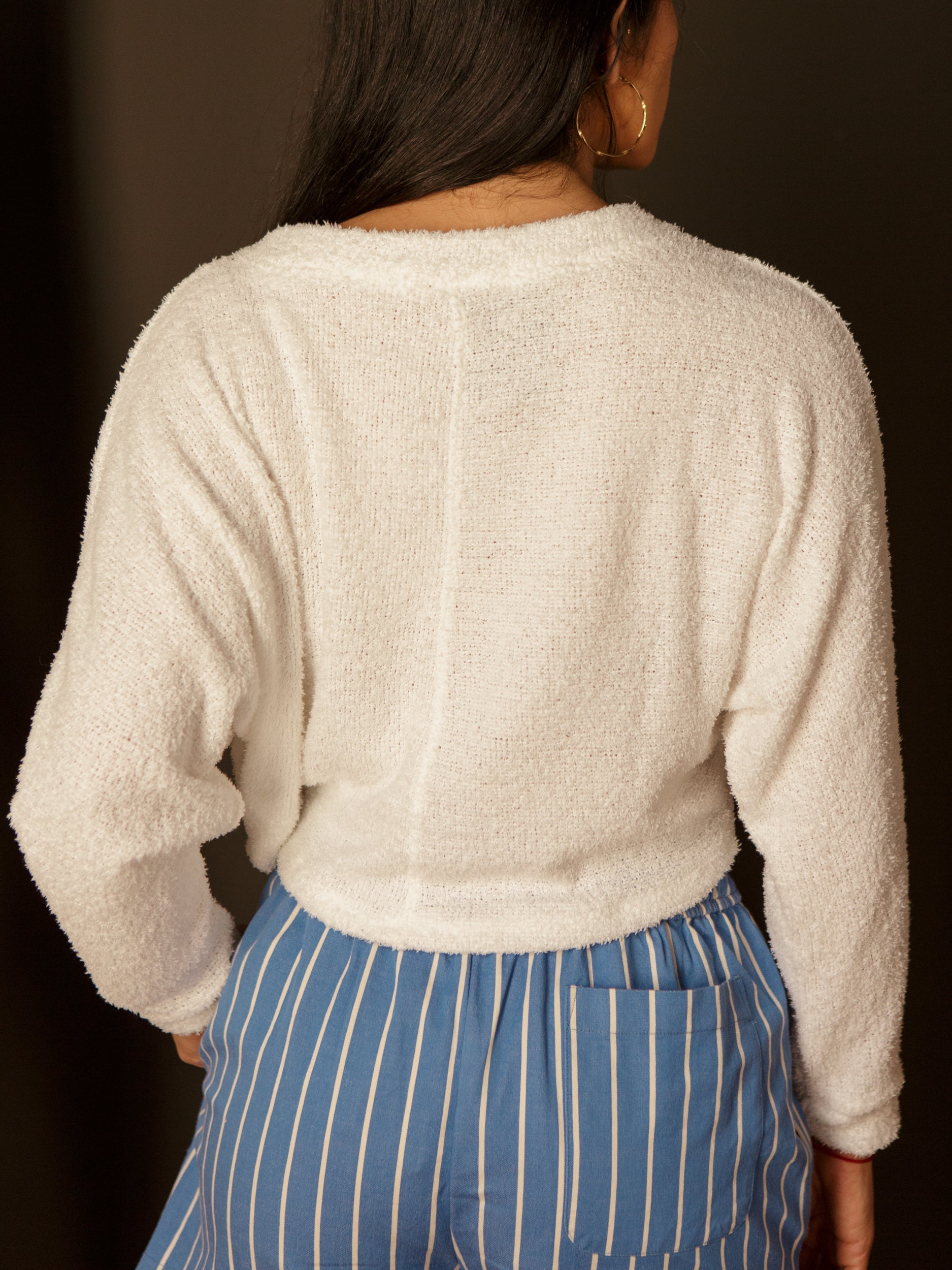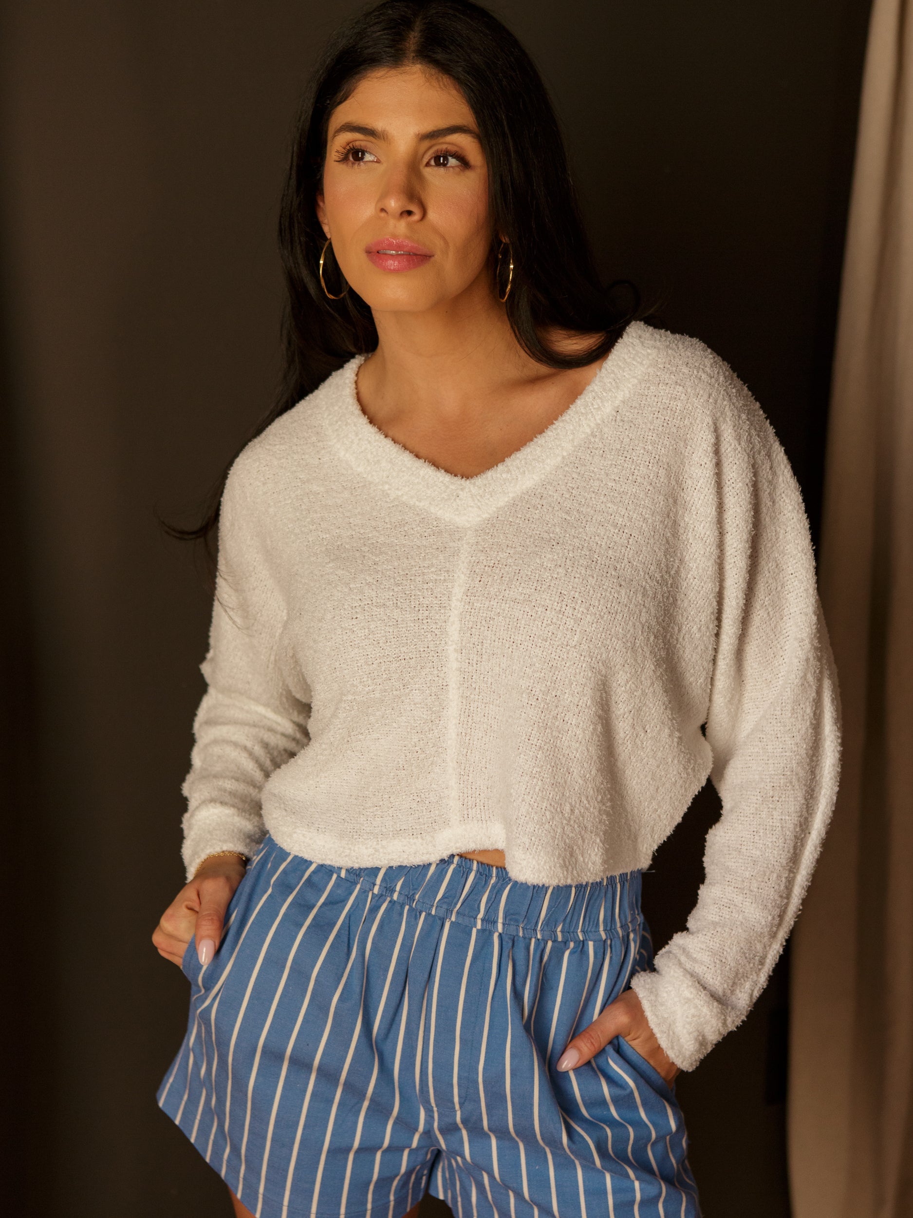 The Cecilia Long Sleeve features a fuzzy, lightweight texture, flattering V-neckline, and cropped length that’s perfect with high-rise denim or cargos. Easy to dress up or down, this one’s a total cold-weather fave.