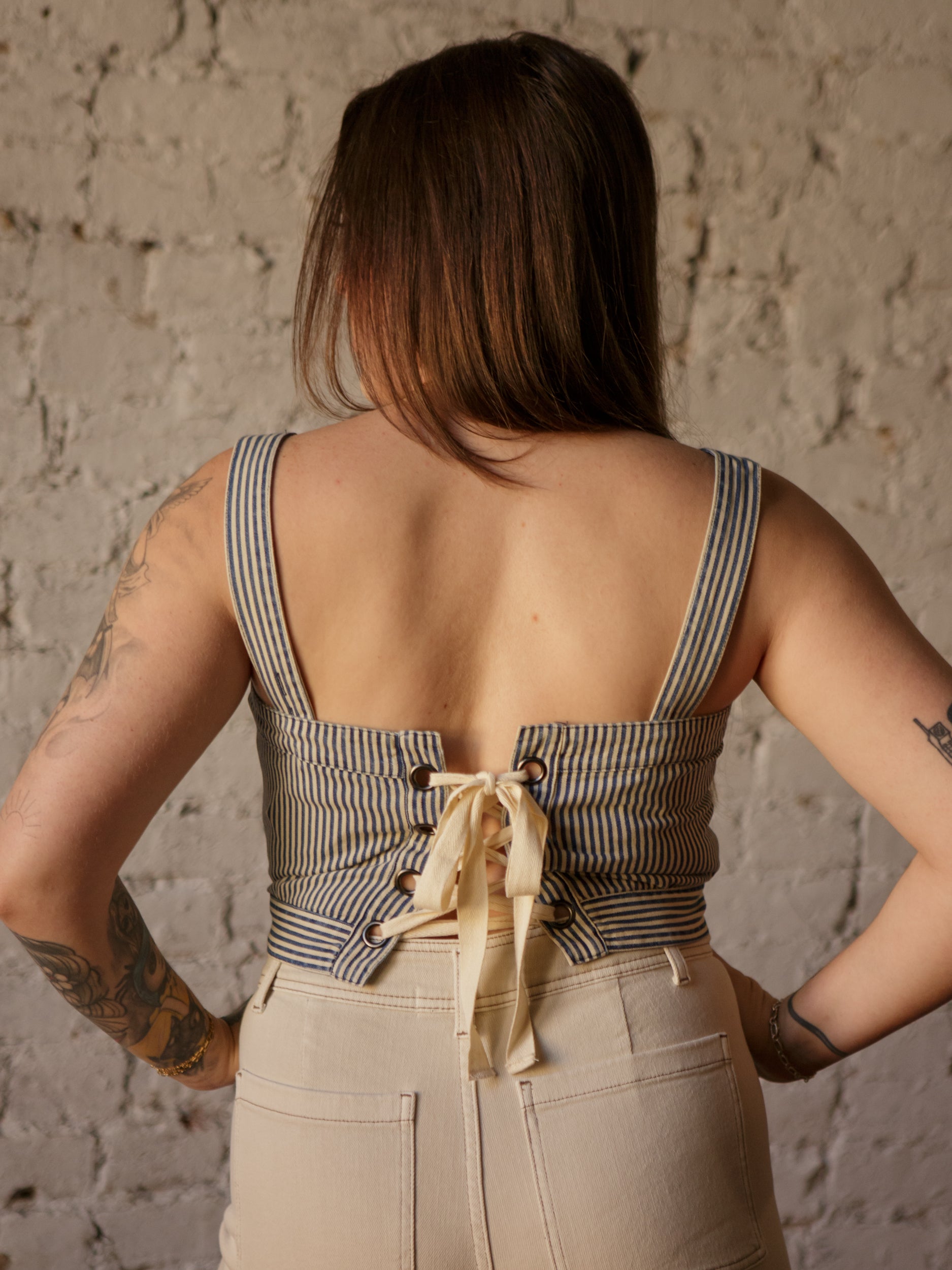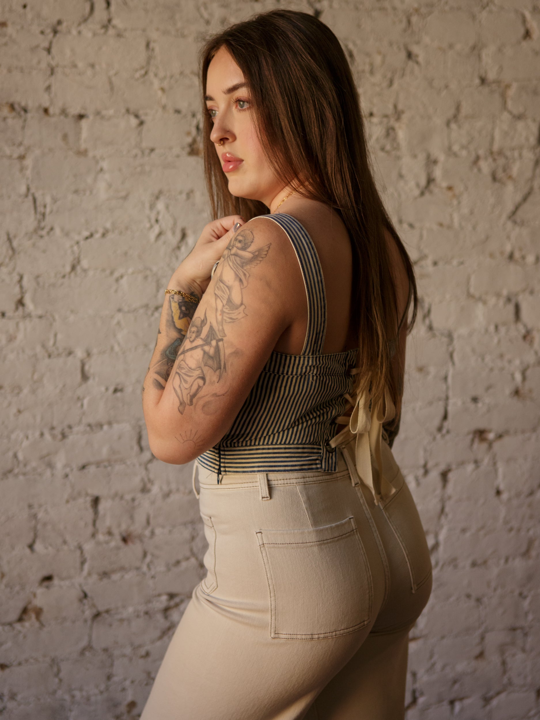 The Joslyn Striped Top is your new go-to. Featuring a square neckline, adjustable button straps, and a lace-up back, this cropped cutie nails that effortless cool-girl vibe. Pair it with high-rise denim or a flowy midi skirt for instant weekend energy.