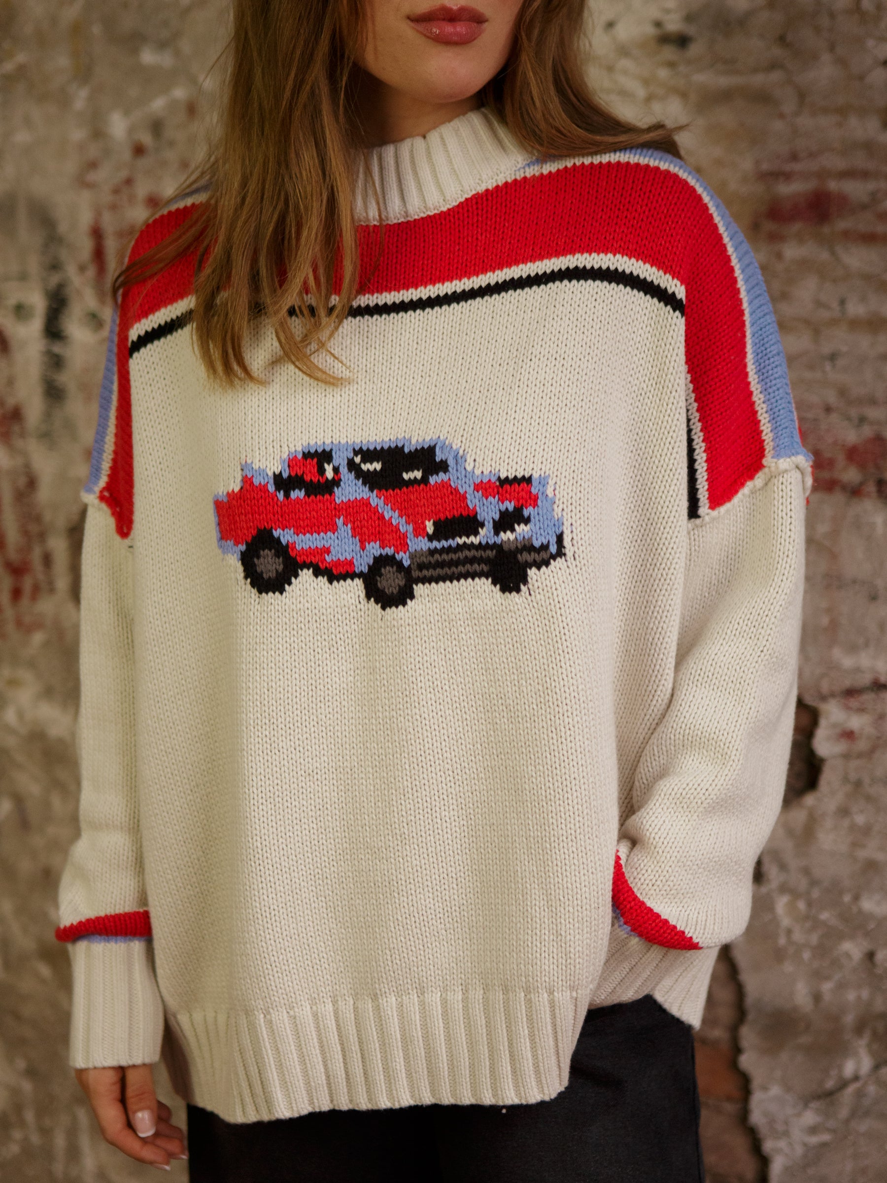 The Oldsmobile Sweater is your new go-to for retro-cool coziness. With color-block details, a playful vintage car graphic, and an oversized, ultra-comfy fit, it’s perfect for lounging, coffee runs, or showing up to casual hangouts with instant style.