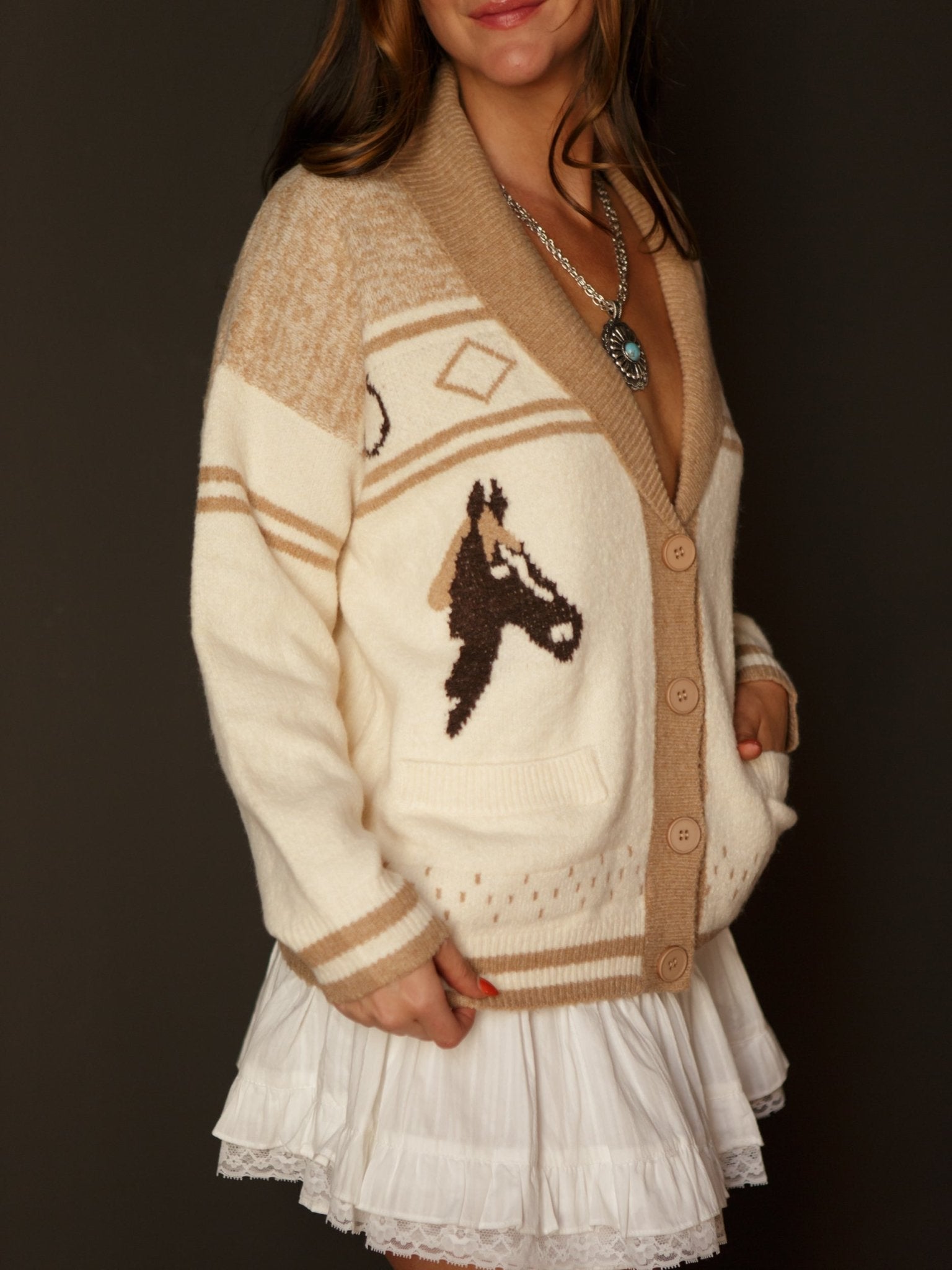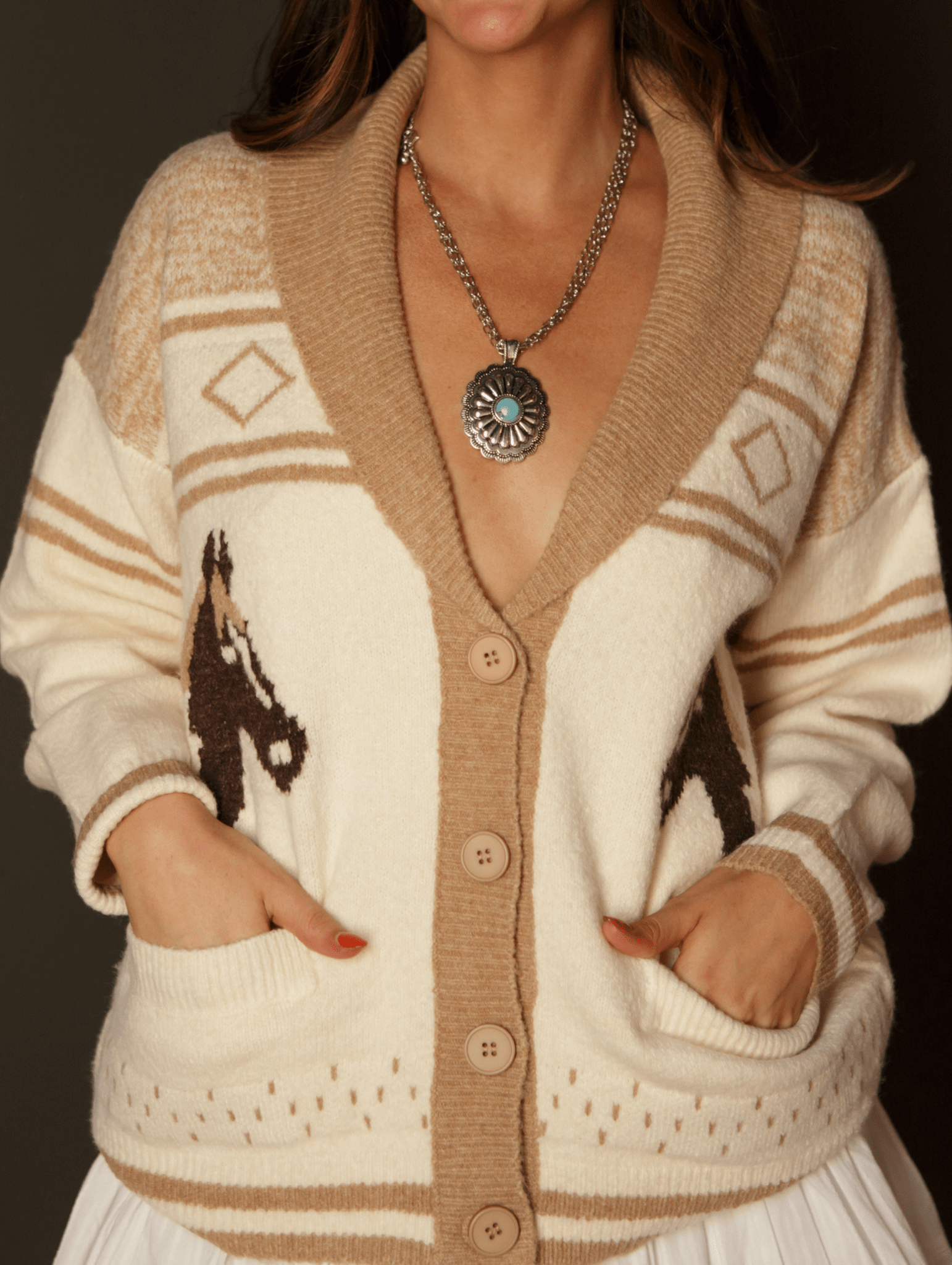 Giddy up in cozy style with the Safiya Horse Cardigan! Featuring a collared neckline, ribbed trim, and cute horse print, this ultra-soft knit adds a fun twist to your cold-weather lineup. Perfect for pairing with jeans or layering over dresses.