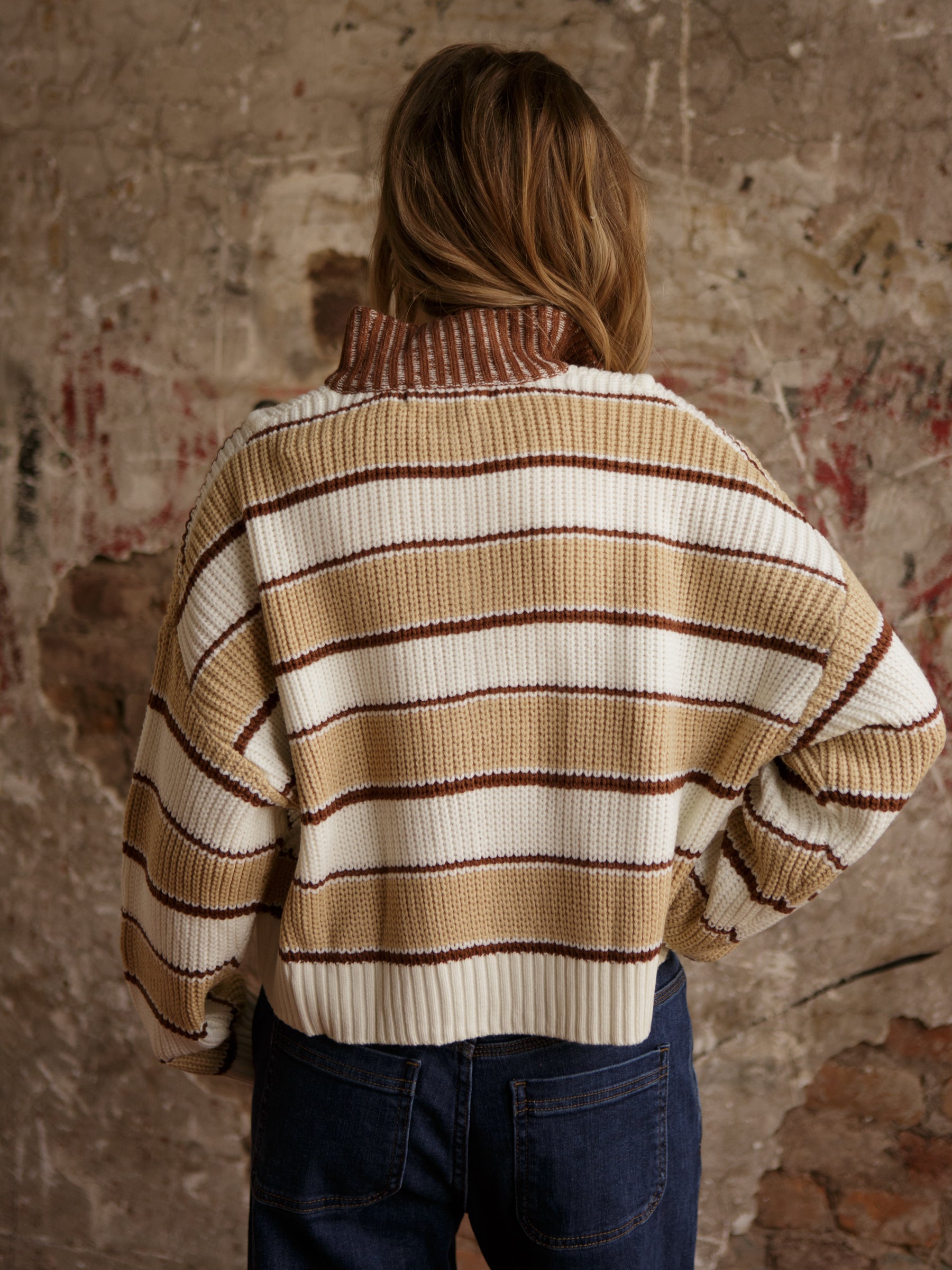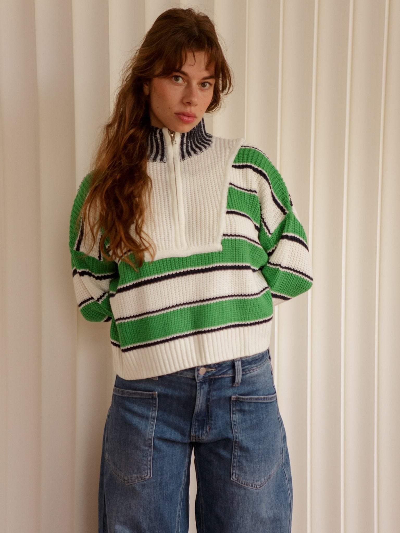 The Trista Stripe Sweater features a collared neckline, zip-up front, and playful stripes in a chunky knit. With ribbed trim and a relaxed fit, it’s perfect for layering over tees or pairing with denim for those chill weekend vibes.