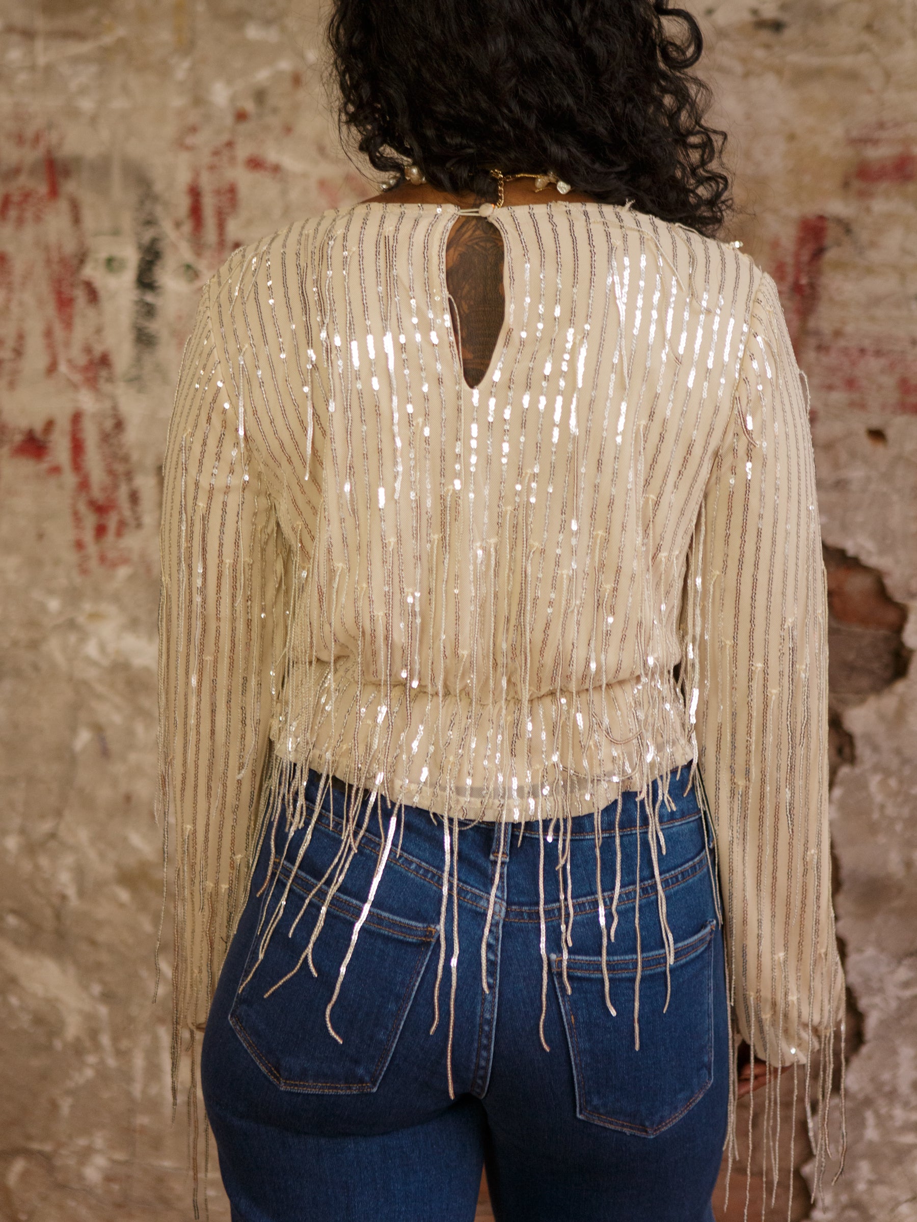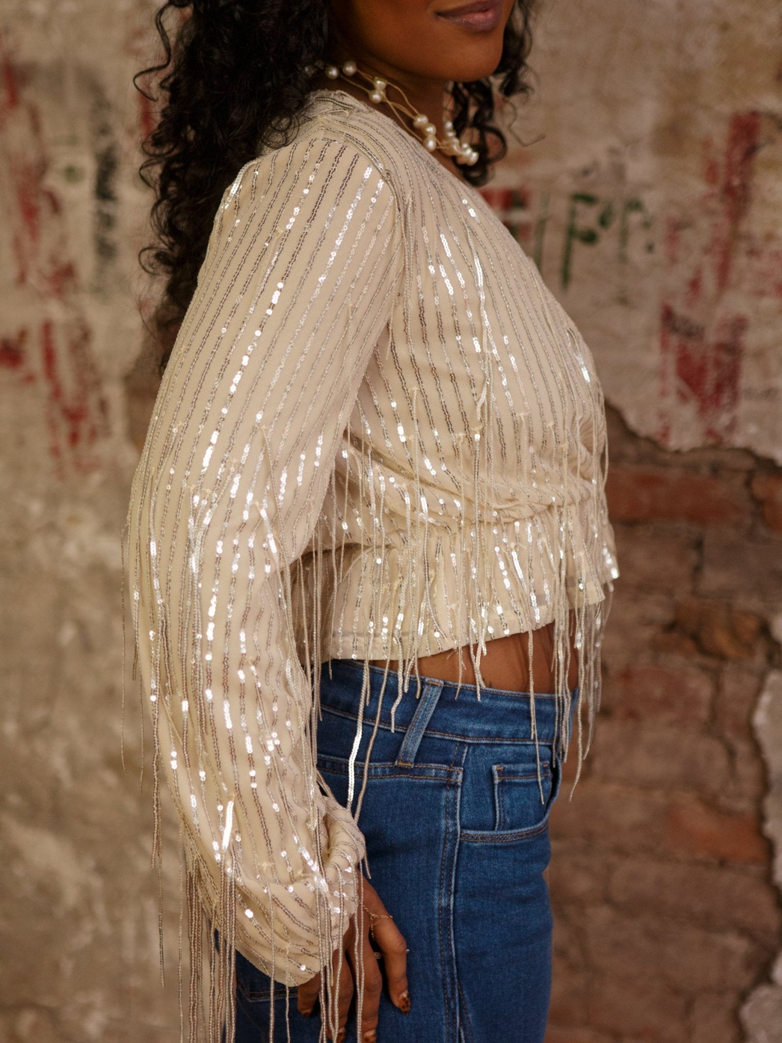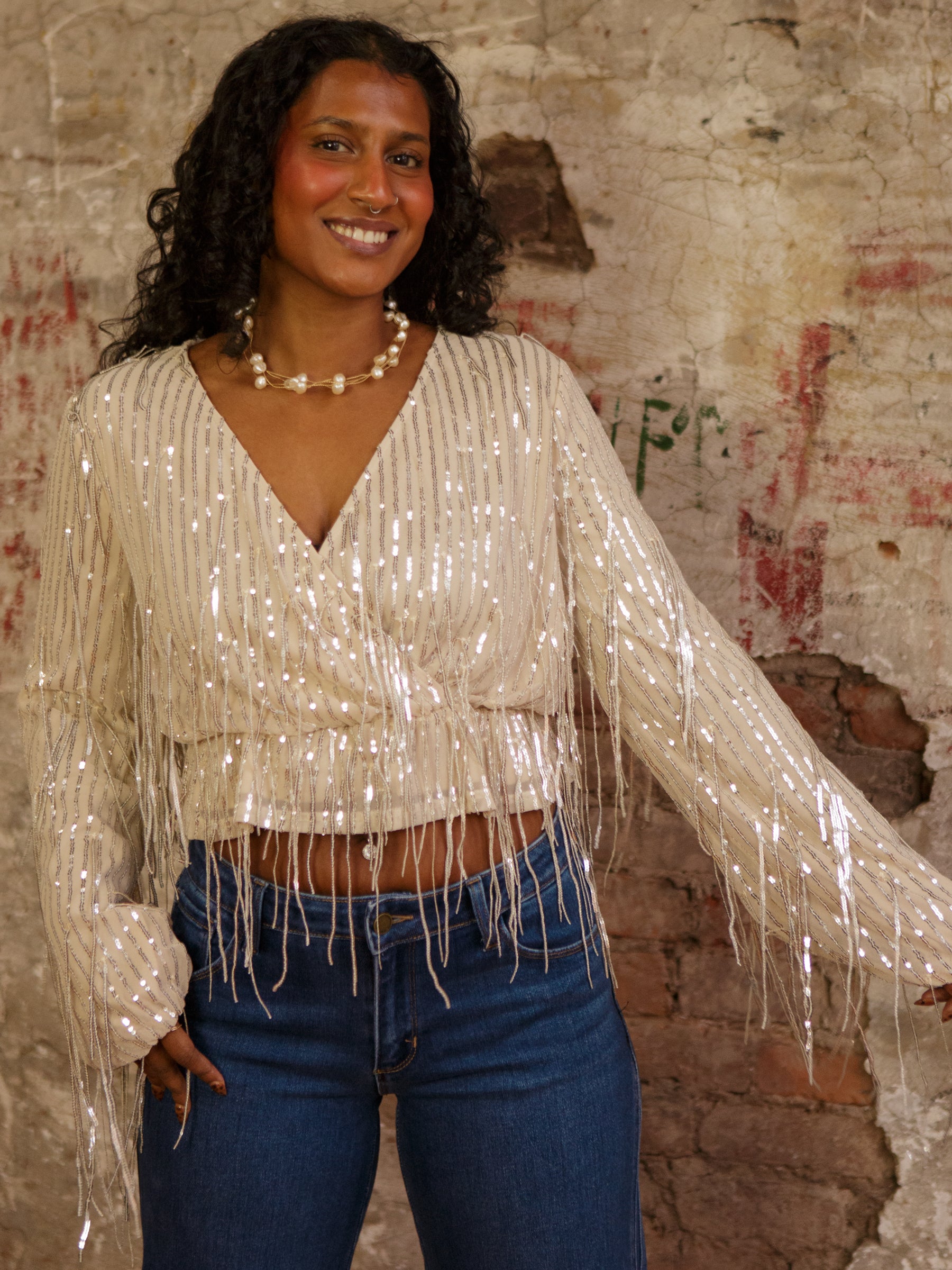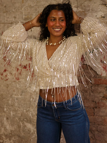 The Arabella Sequins Top is ready to steal the spotlight. With a cute V neckline, long sleeves, and that swooshy sequin fringe, it’s basically your new party bestie.