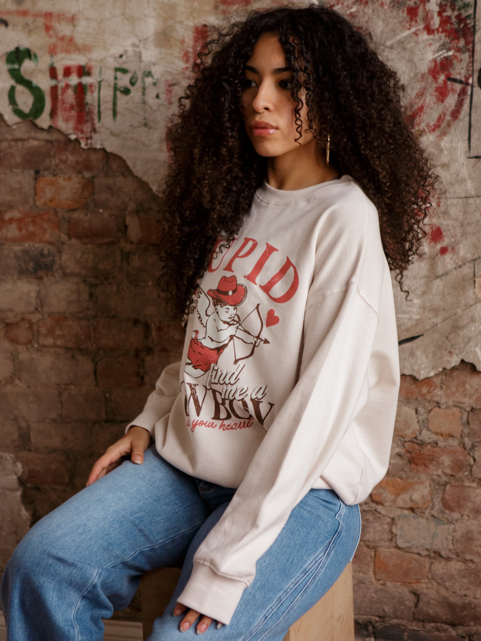 The Cupid Cowboy Sweater mixes western charm with a fun graphic moment, all in a comfy, lightweight sweatshirt-style fit. With ribbed trim and an oversized silhouette, it’s perfect for casual days, concert nights, or anytime you wanna serve a little yeehaw energy.