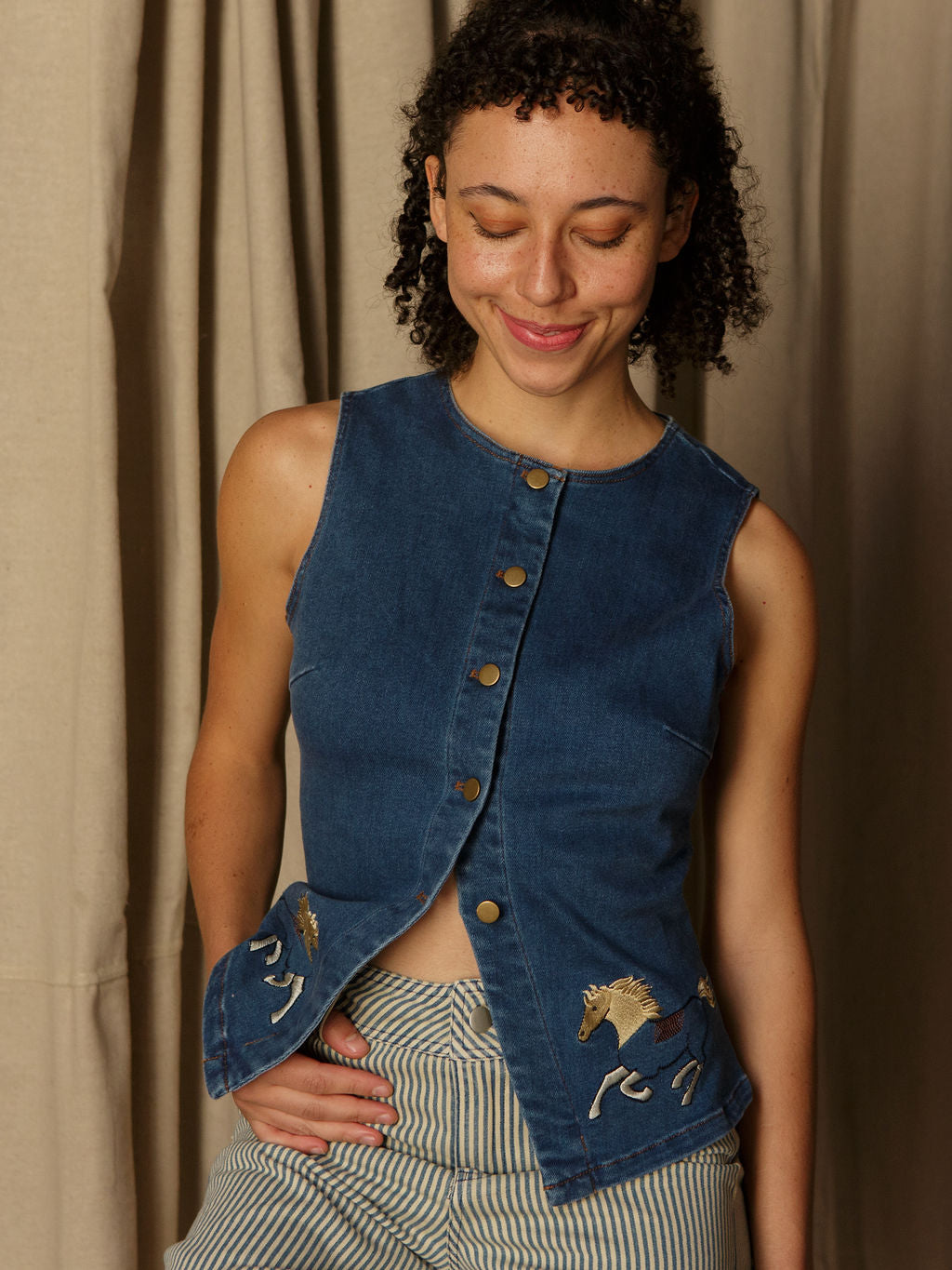 The Jesibell Denim Vest is here to bring a little western magic to your outfit. This sleeveless, button-up cutie features embroidered horses and an adjustable tie back so you can cinch it just how you like. With a classic denim feel and minimal stretch, it’s perfect over tees, dresses, or styled solo for a bold moment.