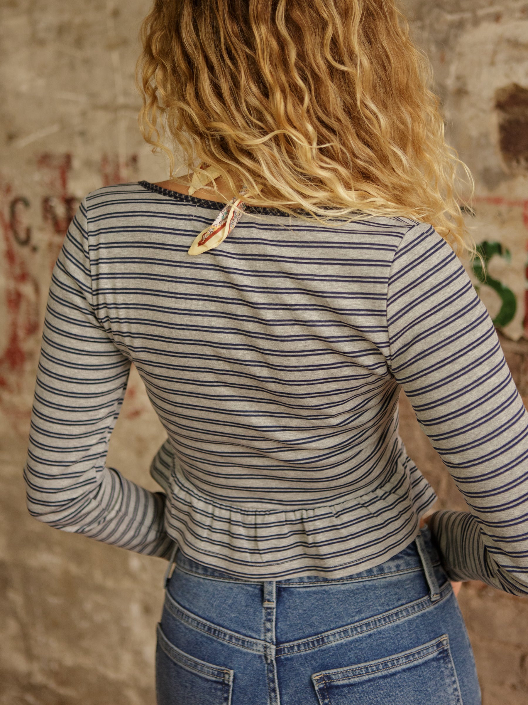 Say hi to the Penny Peplum Top — the striped little number that’s equal parts comfy and adorable. With a square neckline, snap-front detail, and a breezy peplum hem, it gives you that easy, put-together look without trying too hard.