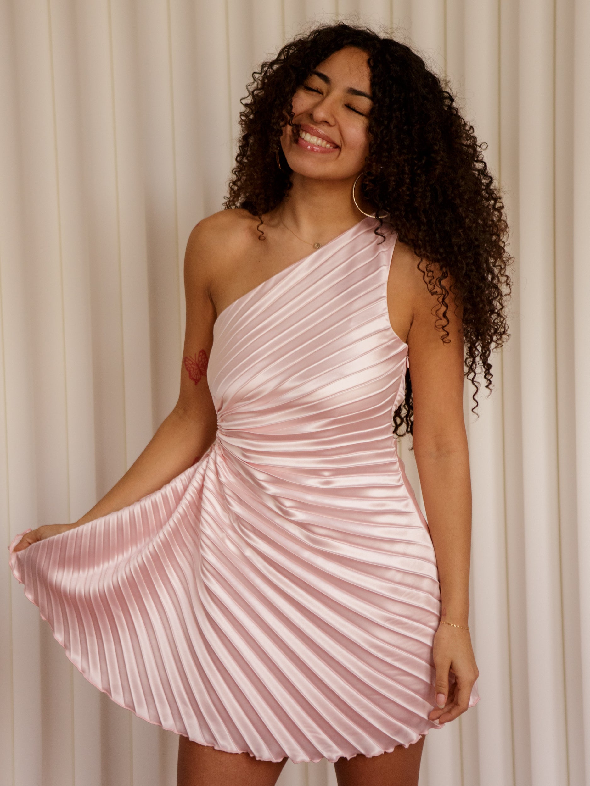The Chelley One Shoulder Dress is your flirty-meets-fierce moment. With its one-shoulder neckline, side cutout with a tie detail, and all-over pleats, this mini brings all the drama in the best way. Just slip it on for nights out with the girls, rooftop dinners, or that party where you definitely want to turn heads.