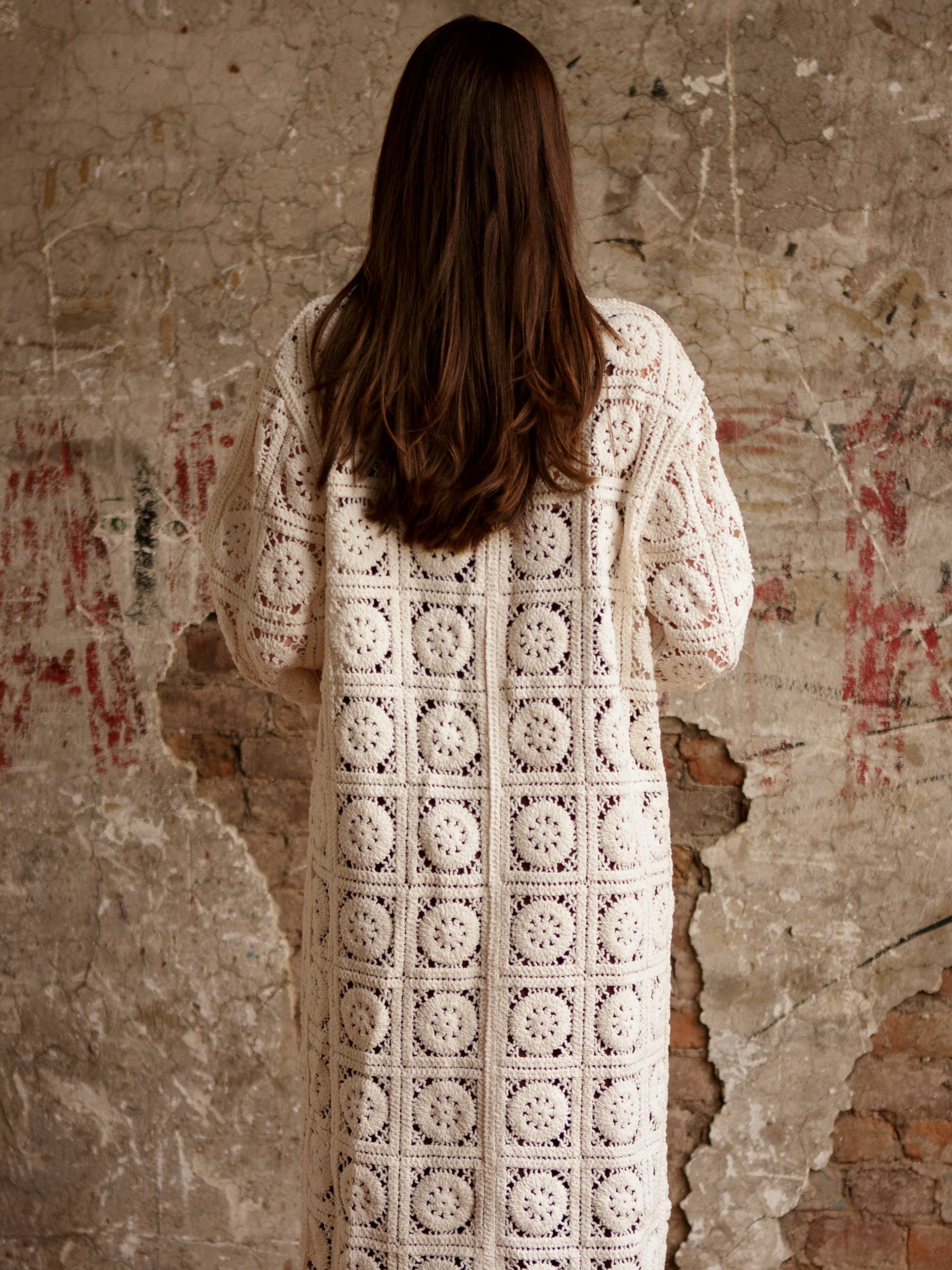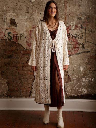 The Halle Knitted Overlay is the easiest way to elevate a simple outfit. Designed with a lightweight crochet knit, long sleeves, and a longline silhouette, it features a front tie closure for an adjustable fit. Layer it over tanks, tees, or dresses for an effortless, boho-inspired look!