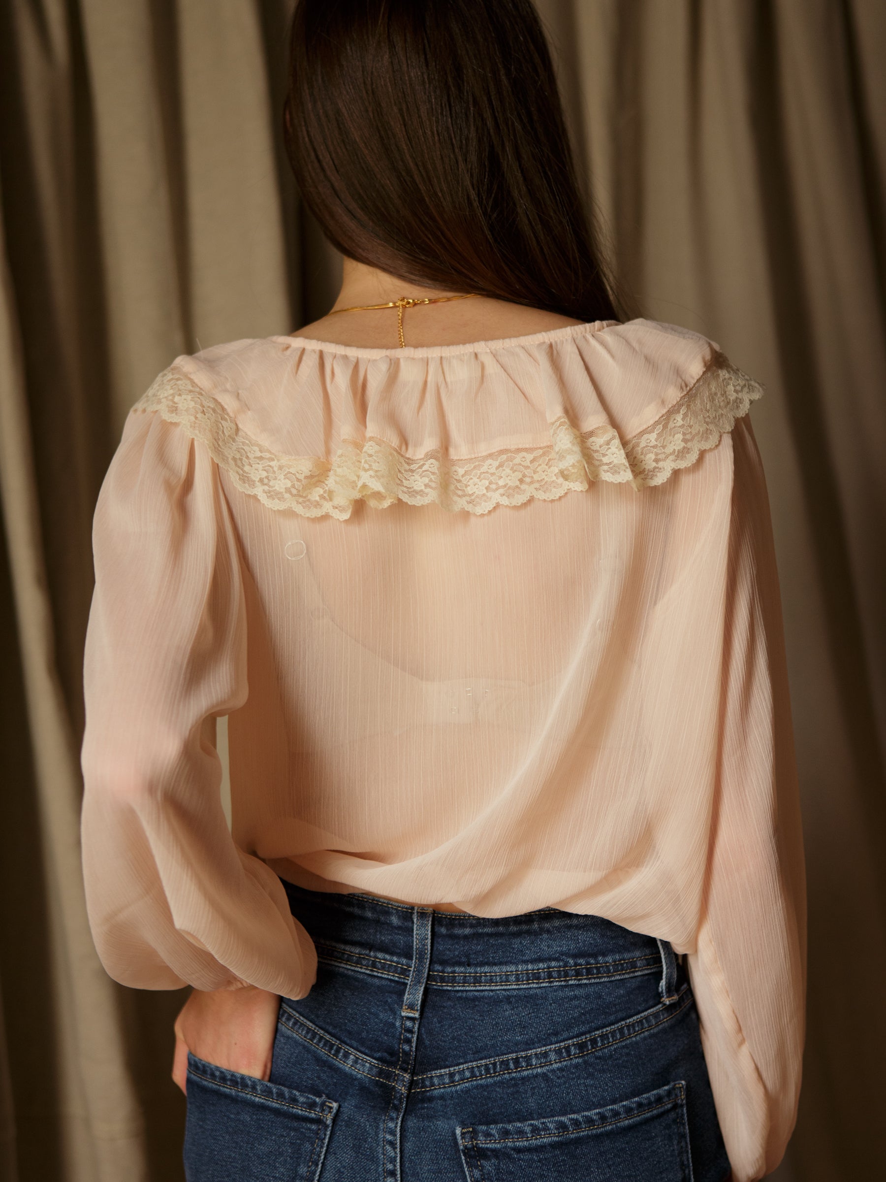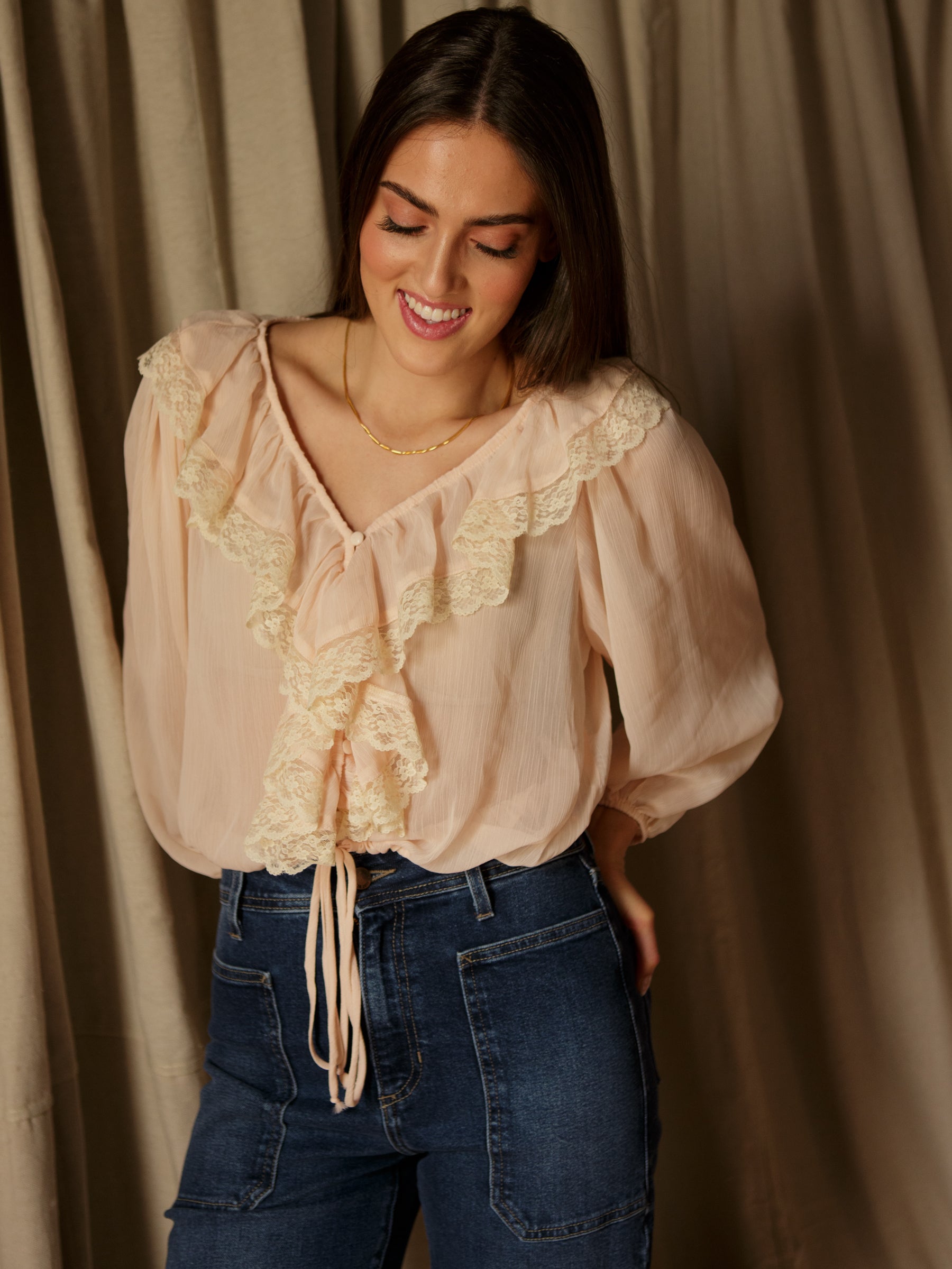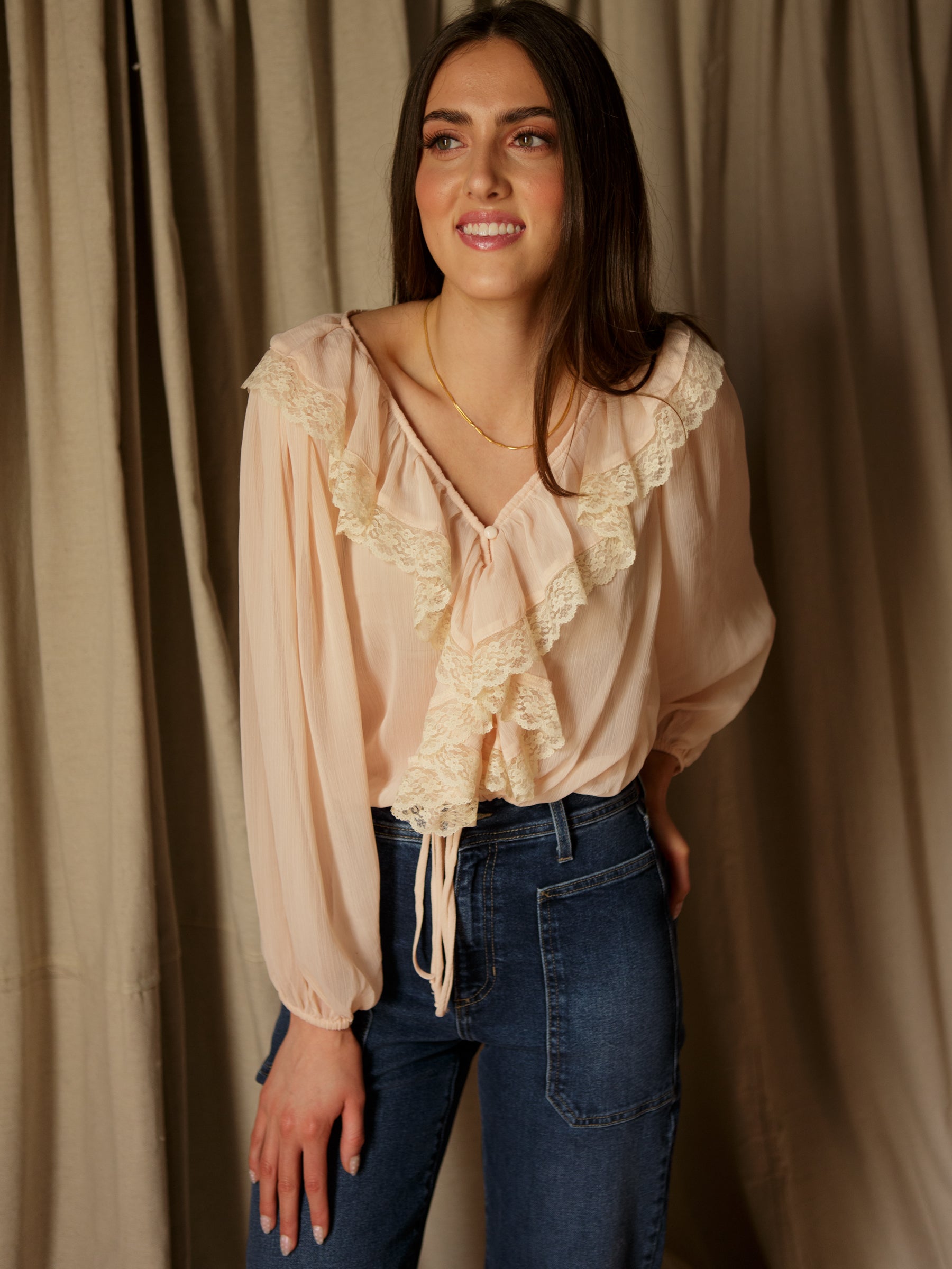 The Melody Ruffle Blouse is all about the pretty details. Featuring a V-neckline, button-up front, and long bubble sleeves, this sheer blouse is finished with soft ruffles and delicate lace trim for an elevated look.
