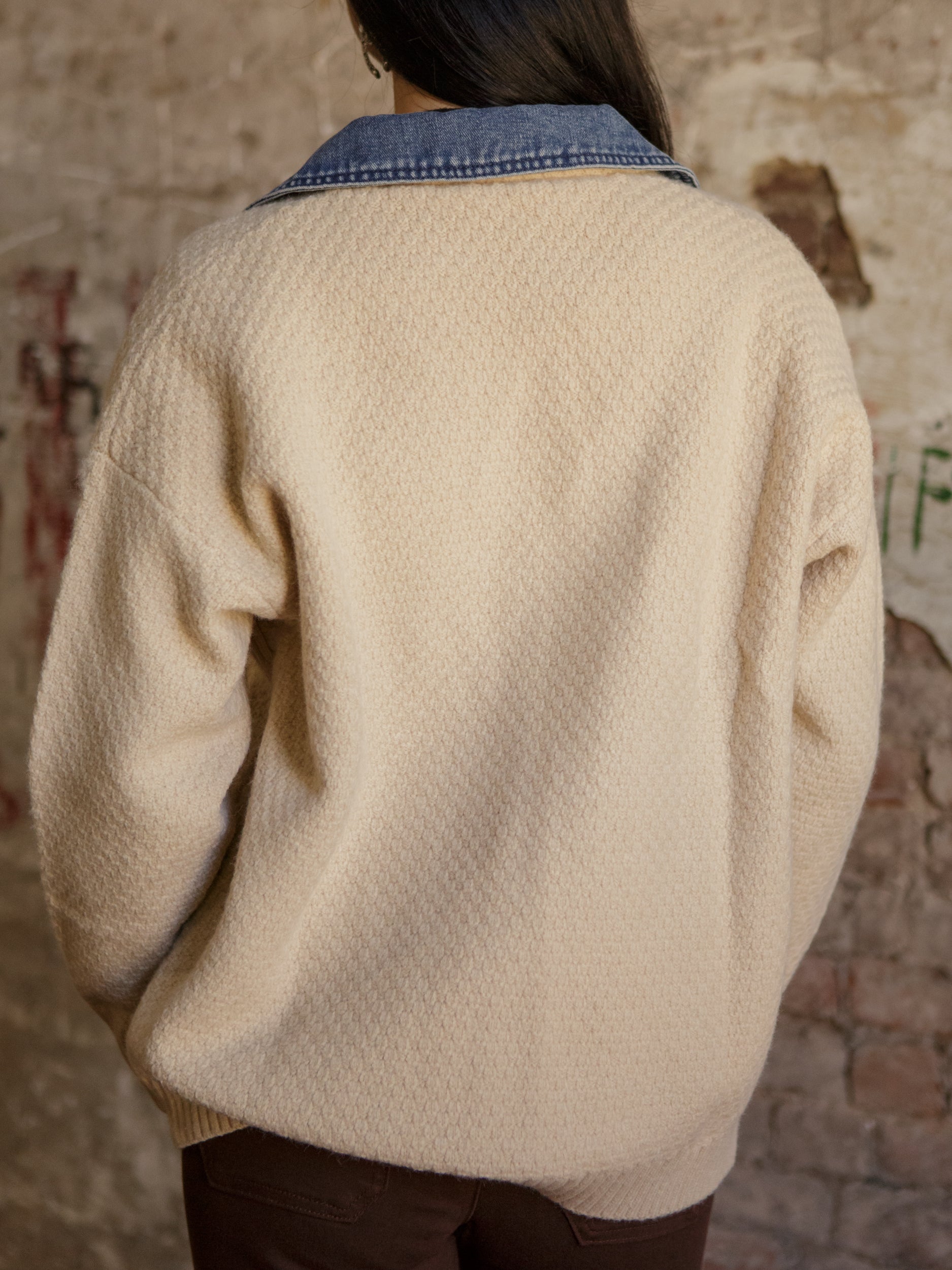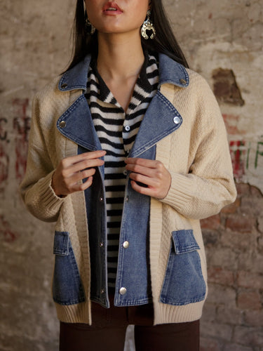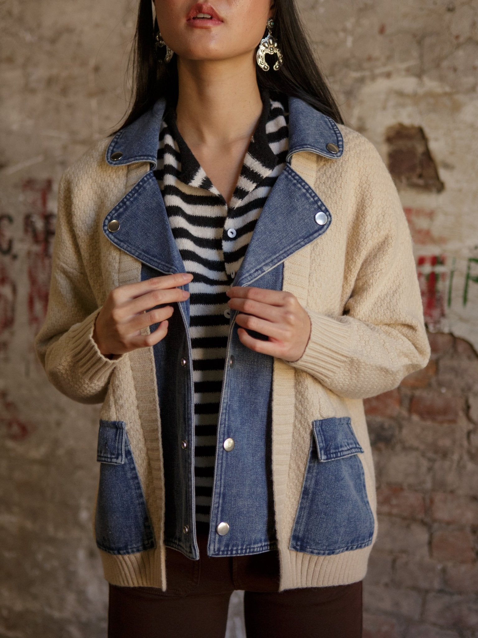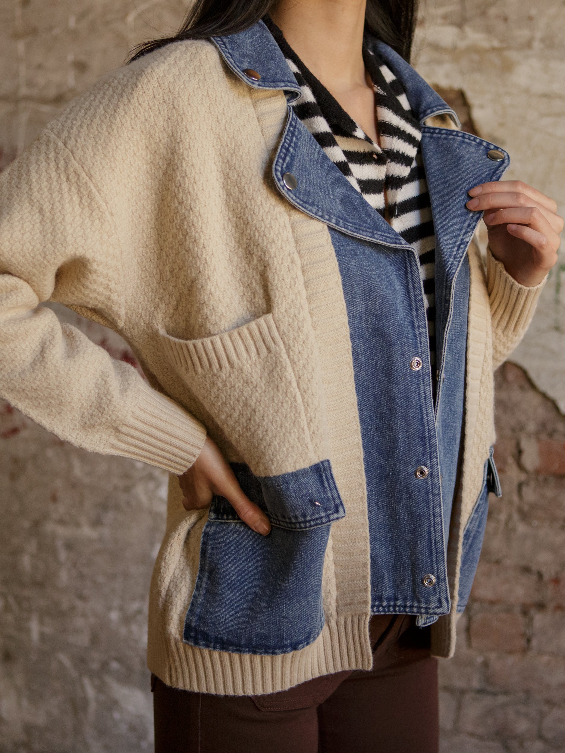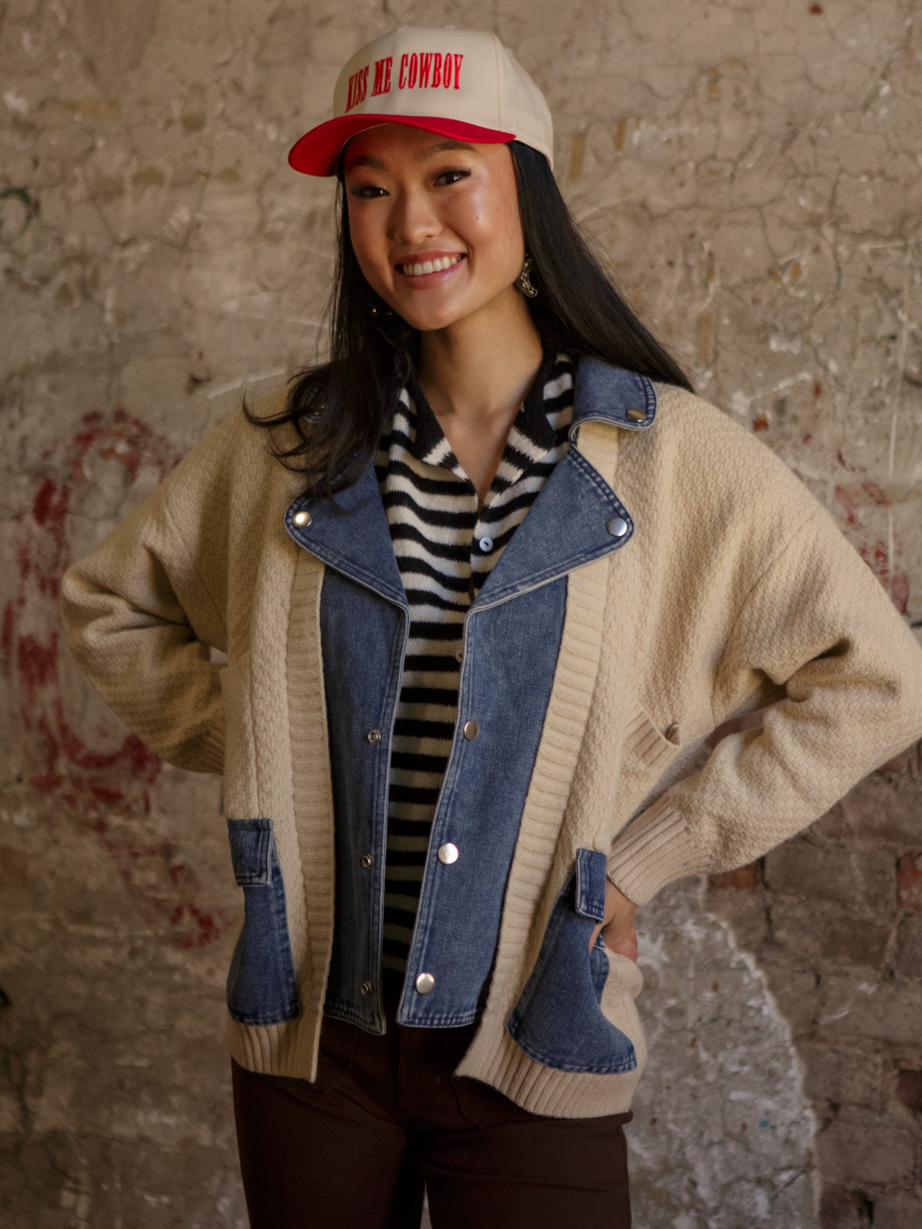 The Dorothy Jacket blends cozy knit comfort with a denim edge. Featuring a collared neckline, button-up front, and denim trim with pockets, it’s the perfect mix of casual and cool for layering all season long.