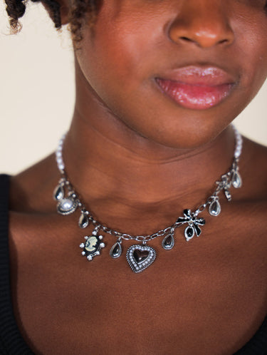 The Heirlooms Trinket Necklace is serving vintage charm with a modern twist. Featuring a pearl chain and gold or silver trinkets, this beauty feels like a treasure passed down—but way cuter. Wear it solo for a delicate moment or layer it up for max sparkle energy.