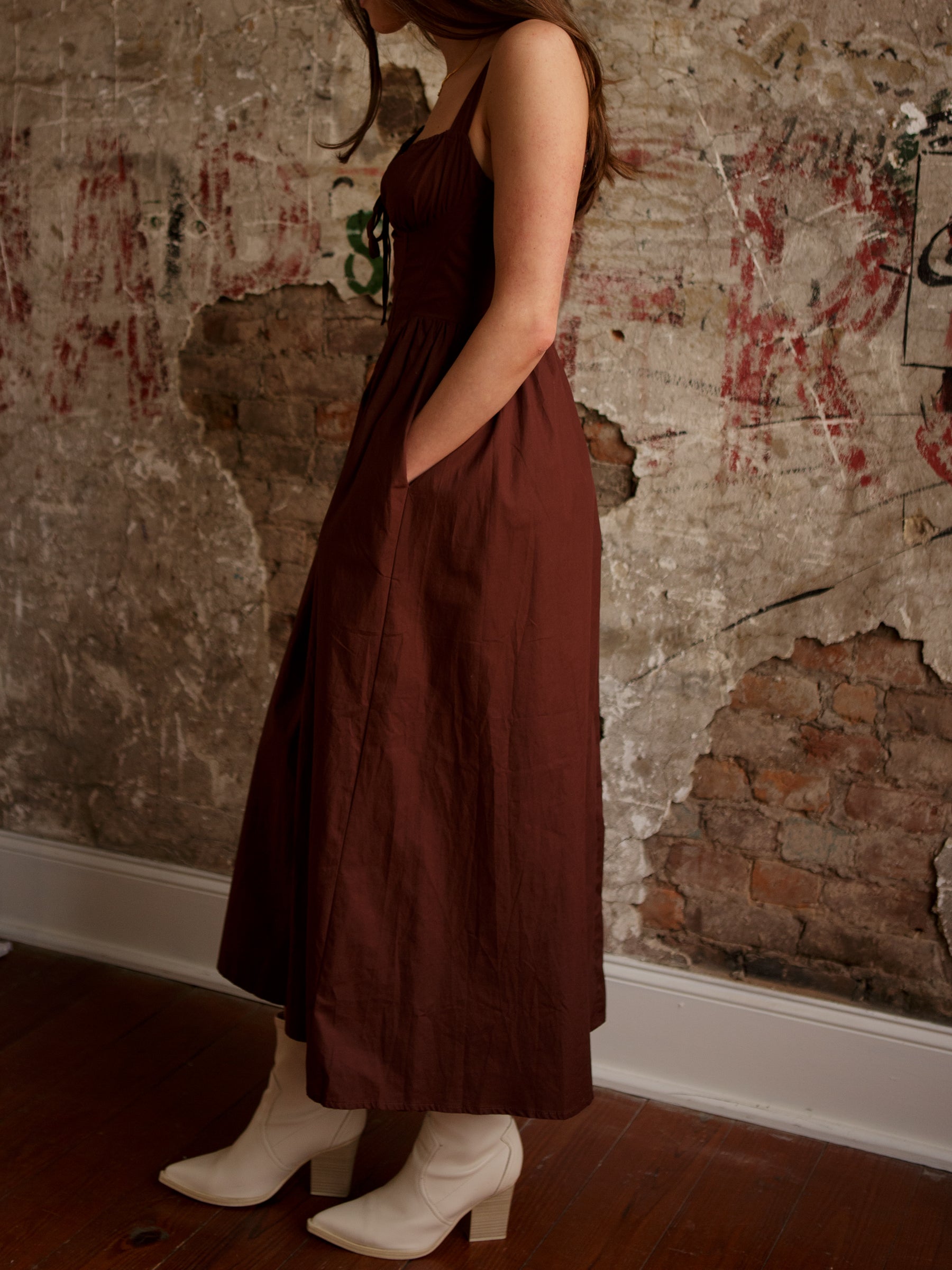 The Mallory Corset Midi Dress is made to flatter. Designed with a sweetheart neckline, thick adjustable shoulder straps, and a bustier-style corset bodice, it features a drop-waist silhouette and a front slit for easy movement. Finished with hidden side pockets and a smocked back with a zipper, this midi dress is equal parts structured and comfortable.